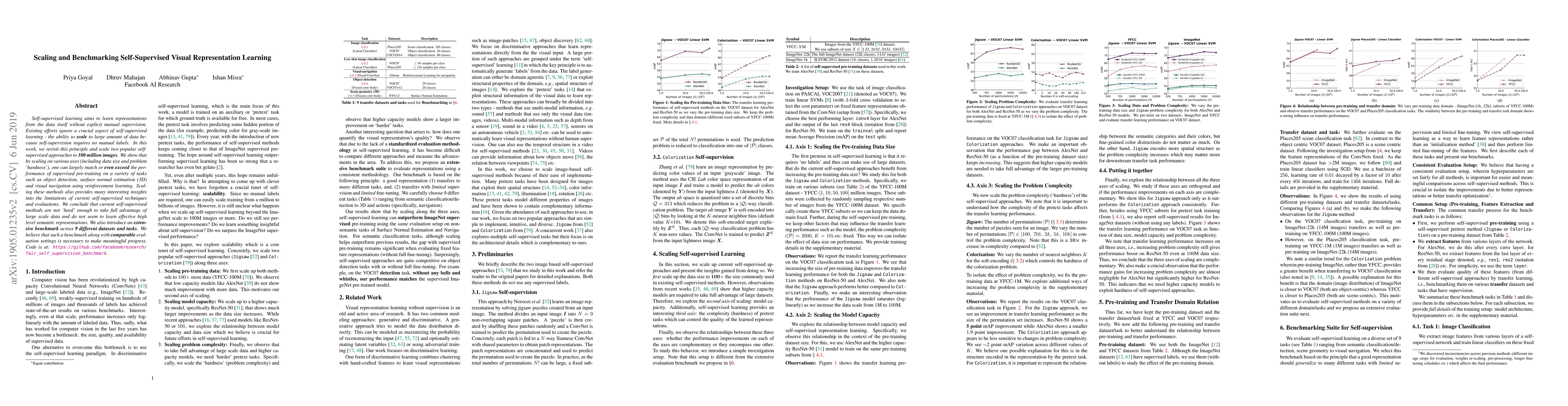 Self-supervised learning aims to learn representations from the data itself without explicit manual supervision. Existing efforts ignore a crucial aspect of self-supervised learning - the ability to scale to large amount of data because self-supervision requires no manual labels. In this work, we revisit this principle and scale two popular self-supervised approaches to 100 million images. We show that by scaling on various axes (including data size and problem 'hardness'), one can largely match or even exceed the performance of supervised pre-training on a variety of tasks such as object detection, surface normal estimation (3D) and visual navigation using reinforcement learning. Scaling these methods also provides many interesting insights into the limitations of current self-supervised techniques and evaluations. We conclude that current self-supervised methods are not 'hard' enough to take full advantage of large scale data and do not seem to learn effective high level semantic representations. We also introduce an extensive benchmark across 9 different datasets and tasks. We believe that such a benchmark along with comparable evaluation settings is necessary to make meaningful progress. Code is at: https://github.com/facebookresearch/fair_self_supervision_benchmark.