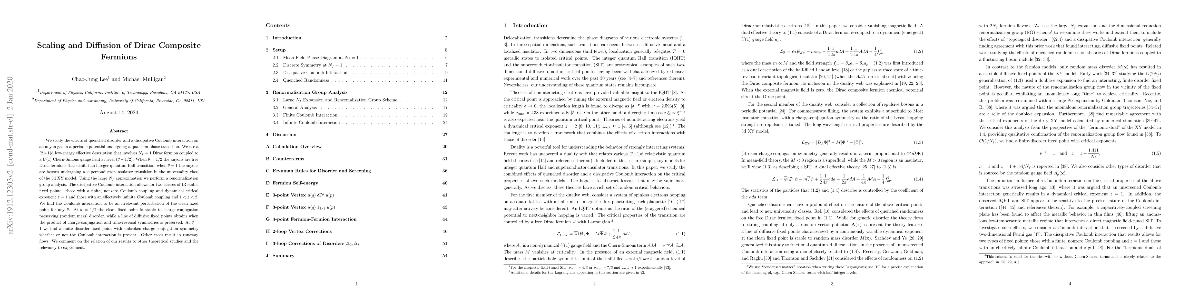 We study the effects of quenched disorder and a dissipative Coulomb interaction on an anyon gas in a periodic potential undergoing a quantum phase transition. We use a $(2+1)$d low-energy effective description that involves $N_f = 1$ Dirac fermion coupled to a $U(1)$ Chern-Simons gauge field at level $(\theta - 1/2)$. When $\theta = 1/2$ the anyons are free Dirac fermions that exhibit an integer quantum Hall transition; when $\theta = 1$ the anyons are bosons undergoing a superconductor-insulator transition in the universality class of the 3d XY model. Using the large $N_f$ approximation we perform a renormalization group analysis. The dissipative Coulomb interaction allows for two classes of IR stable fixed points: those with a finite, nonzero Coulomb coupling and dynamical critical exponent $z = 1$ and those with an effectively infinite Coulomb coupling and $1 < z < 2$. We find the Coulomb interaction to be an irrelevant perturbation of the clean fixed point for any $\theta$. At $\theta = 1/2$ the clean fixed point is stable to charge-conjugation preserving (random mass) disorder, while a line of diffusive fixed points obtains when the product of charge-conjugation and time-reversal symmetries is preserved. At $\theta = 1$ we find a finite disorder fixed point with unbroken charge-conjugation symmetry whether or not the Coulomb interaction is present. Other cases result in runaway flows. We comment on the relation of our results to other theoretical studies and the relevancy to experiment.