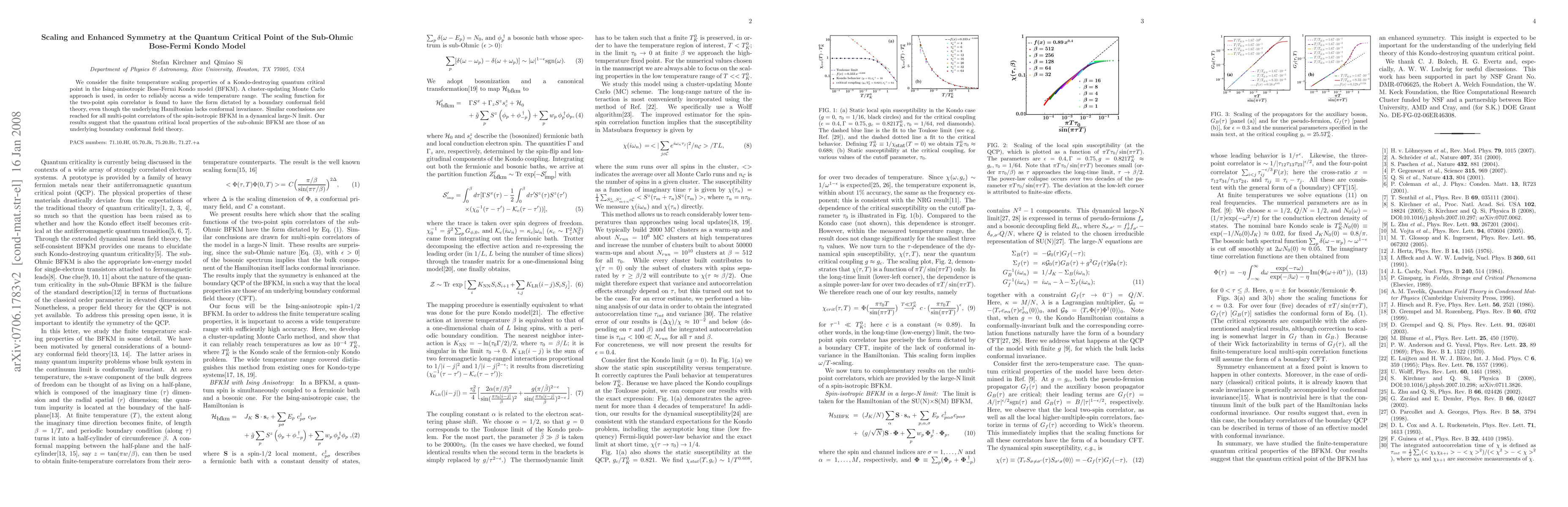 This paper investigates the scaling behavior at the quantum critical point of a Bose-Fermi Kondo model using Monte Carlo simulations. The study reveals that despite the lack of conformal invariance in the Hamiltonian, the scaling functions for spin correlators follow those of a boundary conformal field theory, indicating enhanced symmetry at the critical point.