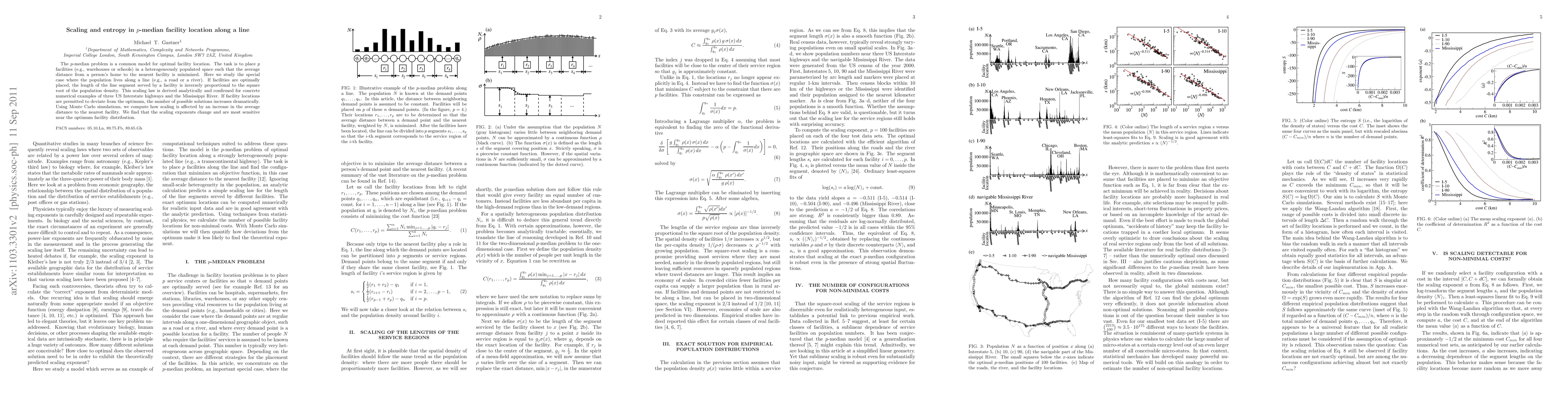 Researchers studied facility location along a line to find optimal placement for warehouses or schools, discovering that distances decrease with population density in a specific scaling law. Adding deviations from the optimum increases possible solutions dramatically, affecting scaling exponents near optimal distributions.