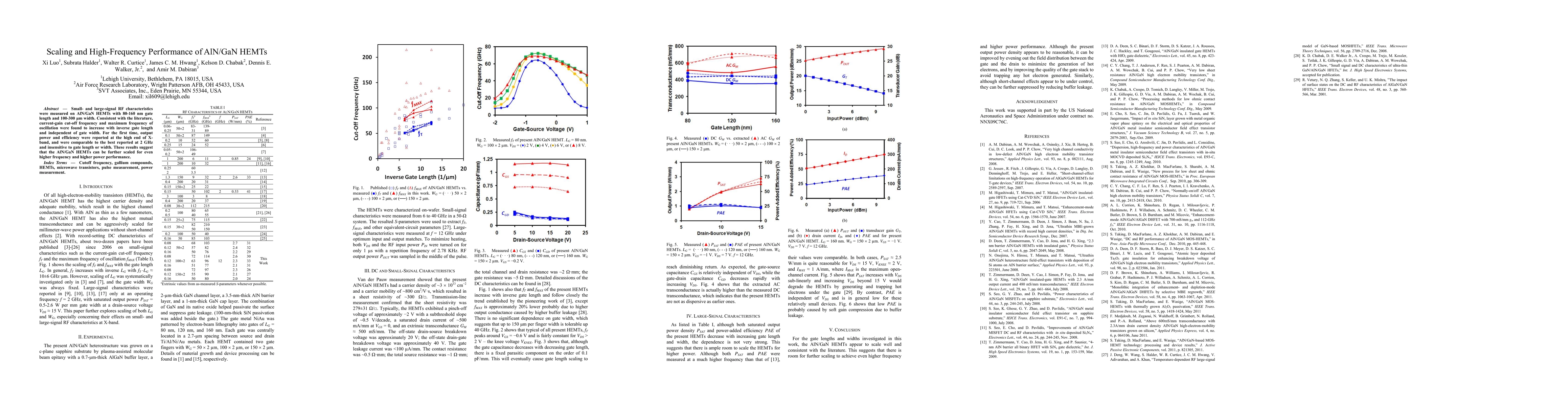 Small- and large-signal RF characteristics were measured on AlN GaN HEMTs with 80-160 nm gate length and 100-300 {\mu}m width. Consistent with the literature, current-gain cut-off frequency and maximum frequency of oscillation were found to increase with inverse gate length and independent of gate width. For the first time, output power and efficiency were reported at the high end of Xband, and were comparable to the best reported at 2 GHz and insensitive to gate length or width. These results suggest that the AlN/GaN HEMTs can be further scaled for even higher frequency and higher power performance.