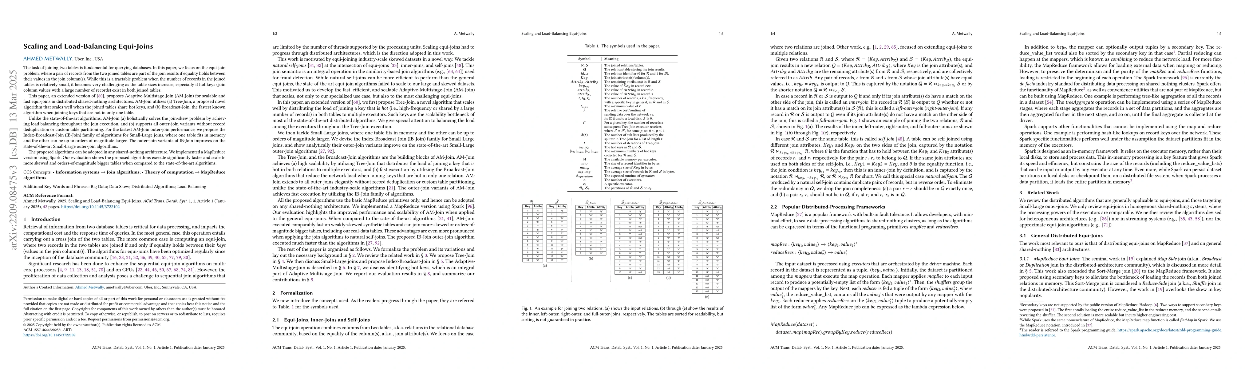 This paper proposes Adaptive-Multistage-Join (AM-Join) for scalable equi-joins in distributed systems, utilizing Tree-Join and Broadcast-Join for handling different join scenarios. The AM-Join algorithm effectively balances load and supports all outer-join variants without requiring record deduplication or custom partitioning.