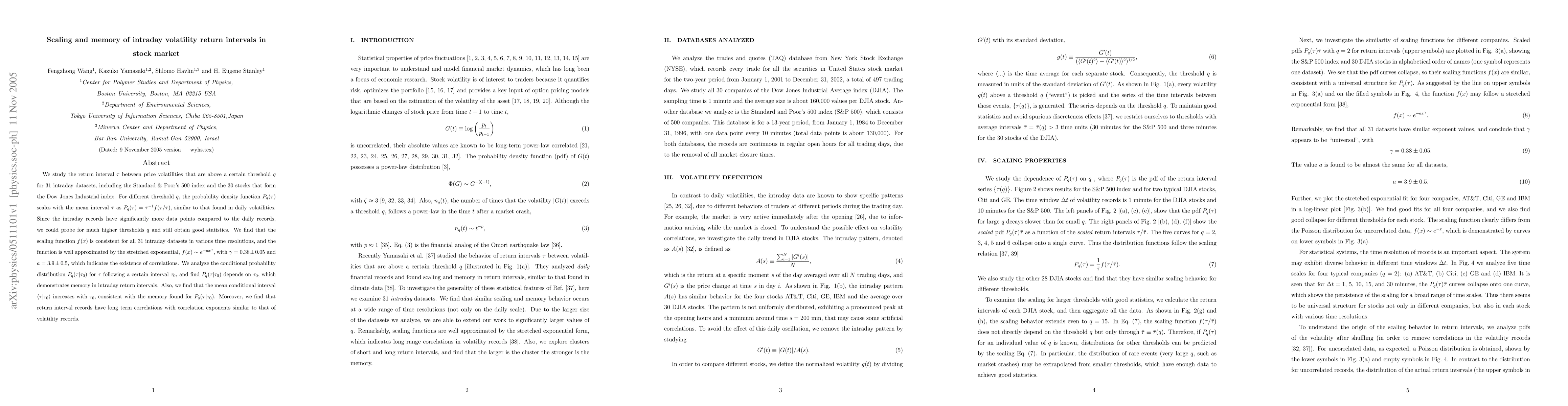 This study analyzes daily stock market volatility return intervals, finding that they scale with a stretched exponential function and exhibit long-term correlations, demonstrating memory in intraday return intervals.
