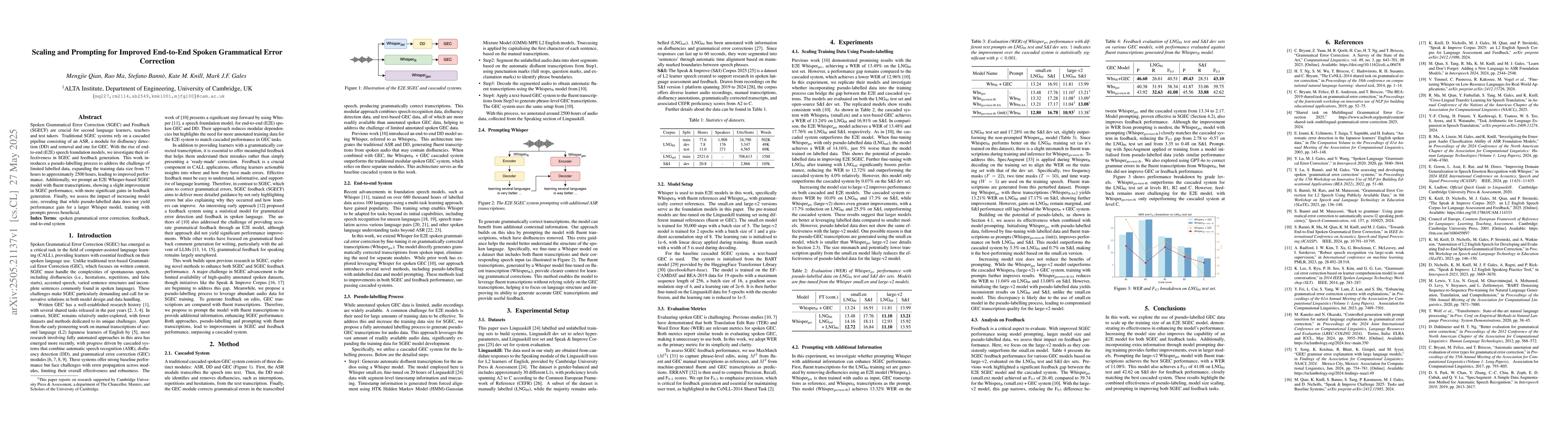 This work stands out by applying scaling and prompting techniques to end-to-end speech foundation models for SGEC and feedback generation, which has not been extensively explored in previous research.