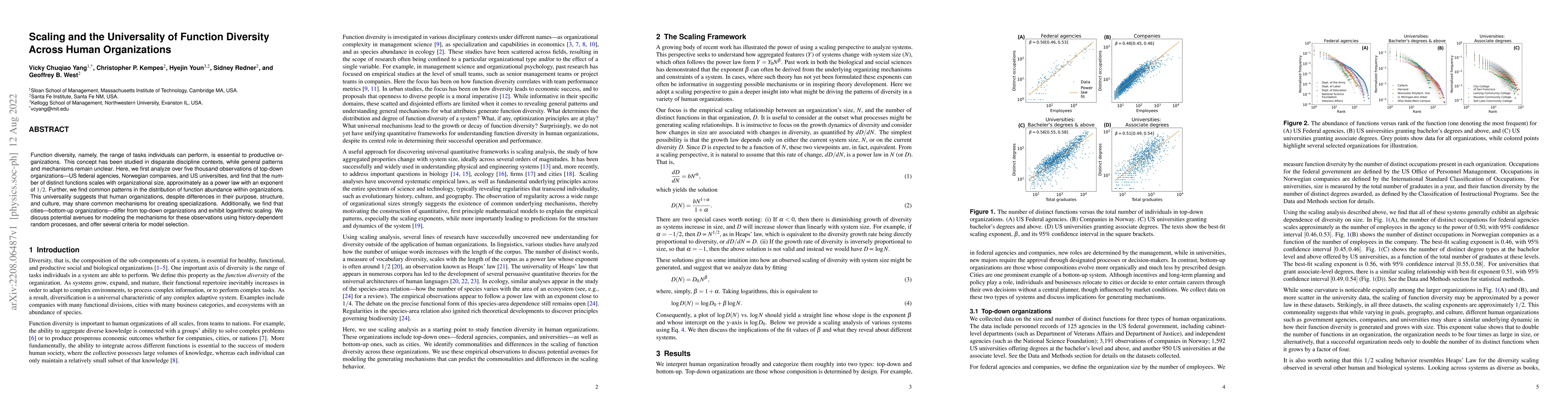 This study reveals that function diversity across various human organizations, such as federal agencies, companies, and universities, scales with size following a power law, suggesting shared mechanisms for creating specializations. In contrast, cities exhibit logarithmic scaling, indicating different organizational dynamics.