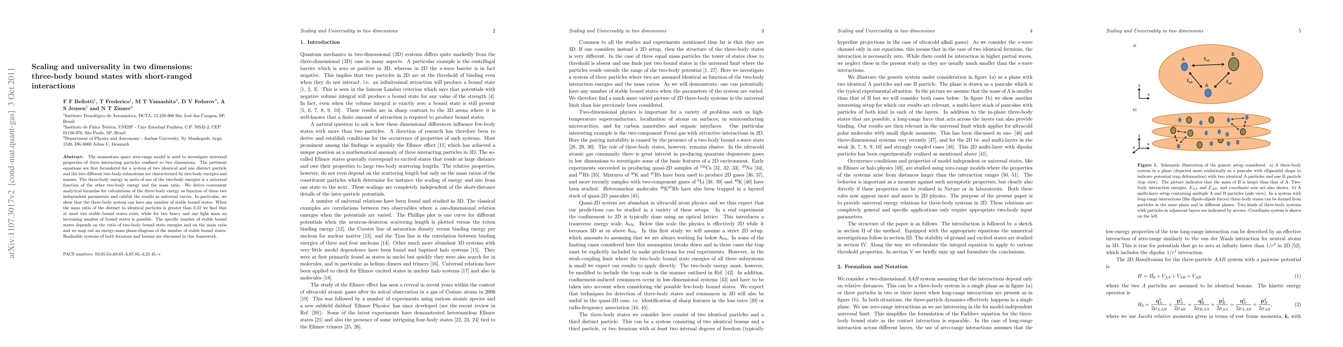 The momentum space zero-range model is used to investigate universal properties of three interacting particles confined to two dimensions. The pertinent equations are first formulated for a system of two identical and one distinct particle and the two different two-body subsystems are characterized by two-body energies and masses. The three-body energy in units of one of the two-body energies is a universal function of the other two-body energy and the mass ratio. We derive convenient analytical formulae for calculations of the three-body energy as function of these two independent parameters and exhibit the results as universal curves. In particular, we show that the three-body system can have any number of stable bound states. When the mass ratio of the distinct to identical particles is greater than 0.22 we find that at most two stable bound states exist, while for two heavy and one light mass an increasing number of bound states is possible. The specific number of stable bound states depends on the ratio of two-body bound state energies and on the mass ratio and we map out an energy-mass phase-diagram of the number of stable bound states. Realizable systems of both fermions and bosons are discussed in this framework.