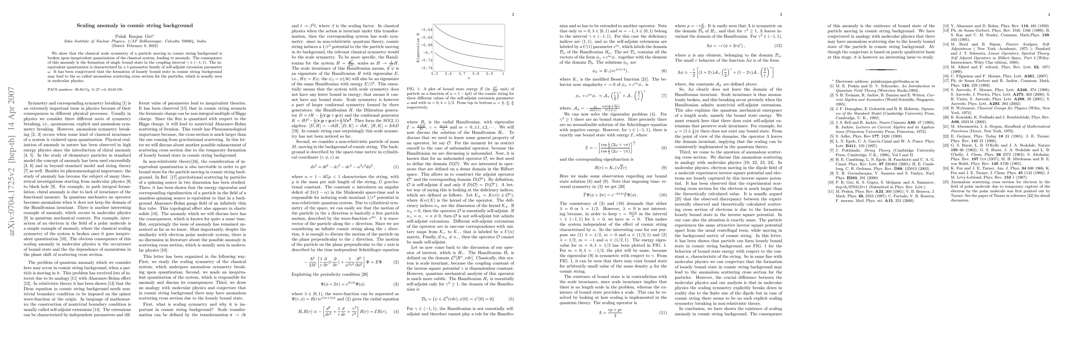 We show that the classical scale symmetry of a particle moving in cosmic string background is broken upon inequivalent quantization of the classical system, leading to anomaly. The consequence of this anomaly is the formation of single bound state in the coupling interval \gamma\in(-1,1). The inequivalent quantization is characterized by a 1-parameter family of self-adjoint extension parameter \omega. It has been conjectured that the formation of loosely bound state in cosmic string background may lead to the so called anomalous scattering cross section for the particles, which is usually seen in molecular physics.