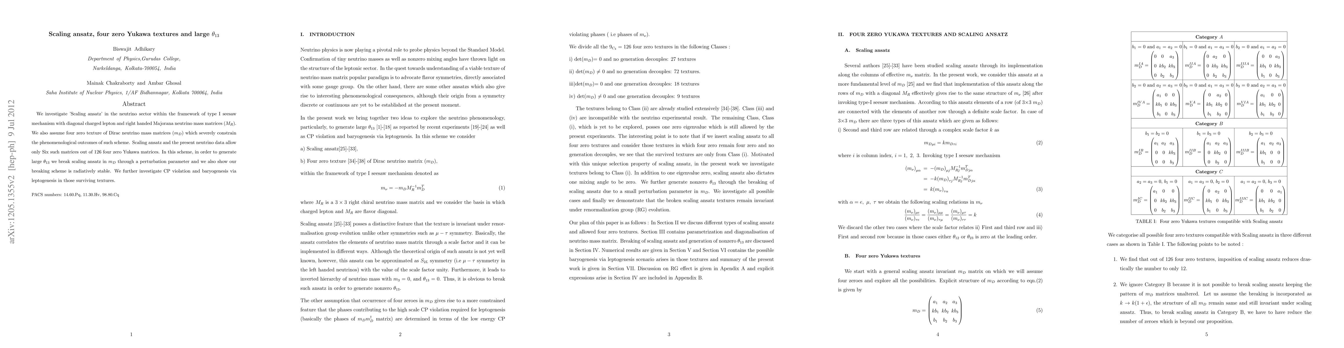 This paper explores the 'Scaling ansatz' in the neutrino sector under the type I seesaw mechanism, focusing on a four zero texture of Dirac neutrino mass matrices. To achieve a large $\theta_{13}$, the scaling ansatz is broken via a perturbation, ensuring radiative stability, and CP violation and leptogenesis are investigated.