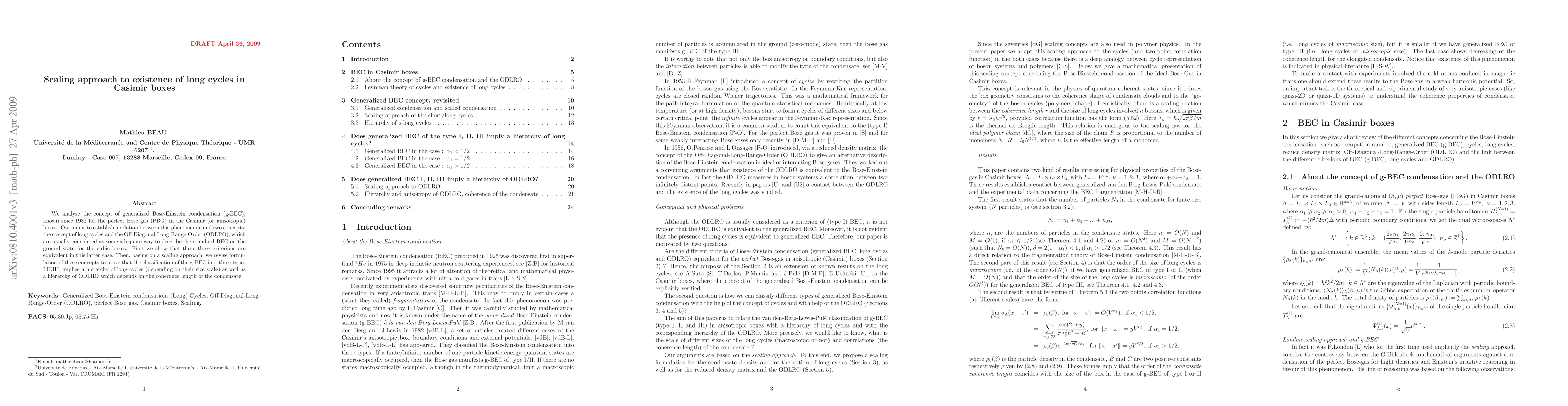 This paper investigates the generalized Bose-Einstein condensation (g-BEC) in Casimir boxes, establishing a connection between g-BEC, long cycles, and Off-Diagonal-Long-Range-Order (ODLRO). It demonstrates that these criteria are equivalent for cubic boxes and uses a scaling approach to show that g-BEC classification leads to a hierarchy of long cycles and ODLRO based on the size scale and coherence length.