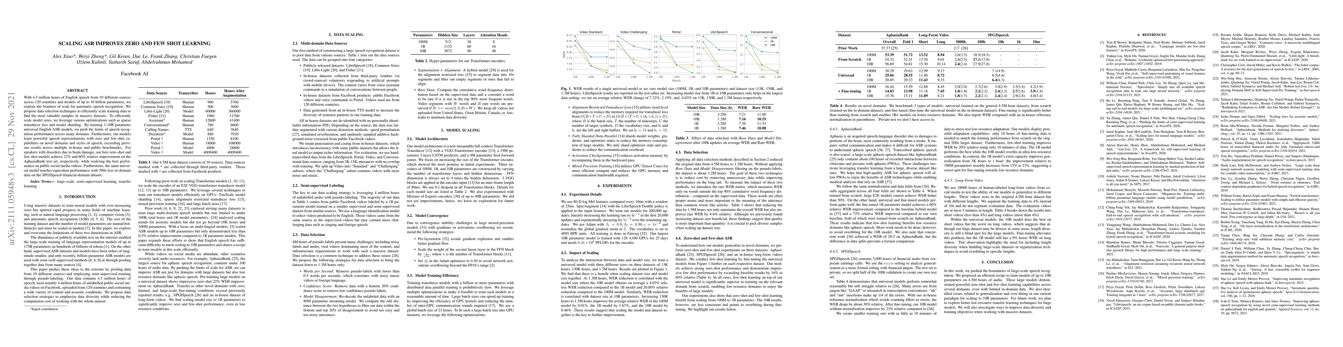 This paper explores how scaling automatic speech recognition (ASR) models improves performance on zero and few-shot learning tasks, achieving significant improvements in various domains. By leveraging data selection techniques and model optimizations, the researchers demonstrate a universal ASR model that outperforms previous results across multiple benchmarks.