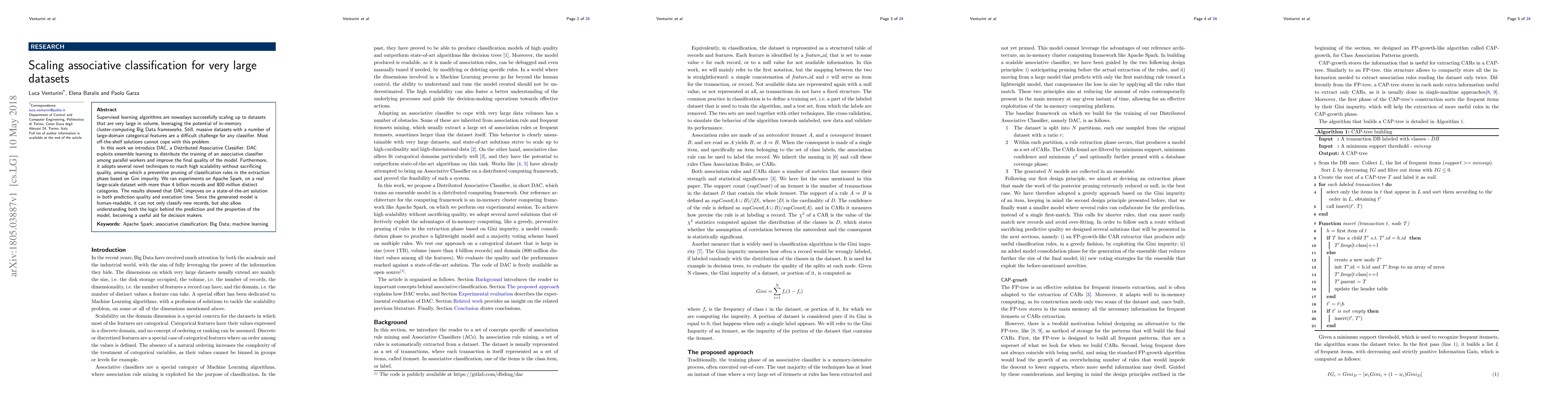 Supervised learning algorithms are nowadays successfully scaling up to datasets that are very large in volume, leveraging the potential of in-memory cluster-computing Big Data frameworks. Still, massive datasets with a number of large-domain categorical features are a difficult challenge for any classifier. Most off-the-shelf solutions cannot cope with this problem. In this work we introduce DAC, a Distributed Associative Classifier. DAC exploits ensemble learning to distribute the training of an associative classifier among parallel workers and improve the final quality of the model. Furthermore, it adopts several novel techniques to reach high scalability without sacrificing quality, among which a preventive pruning of classification rules in the extraction phase based on Gini impurity. We ran experiments on Apache Spark, on a real large-scale dataset with more than 4 billion records and 800 million distinct categories. The results showed that DAC improves on a state-of-the-art solution in both prediction quality and execution time. Since the generated model is human-readable, it can not only classify new records, but also allow understanding both the logic behind the prediction and the properties of the model, becoming a useful aid for decision makers.