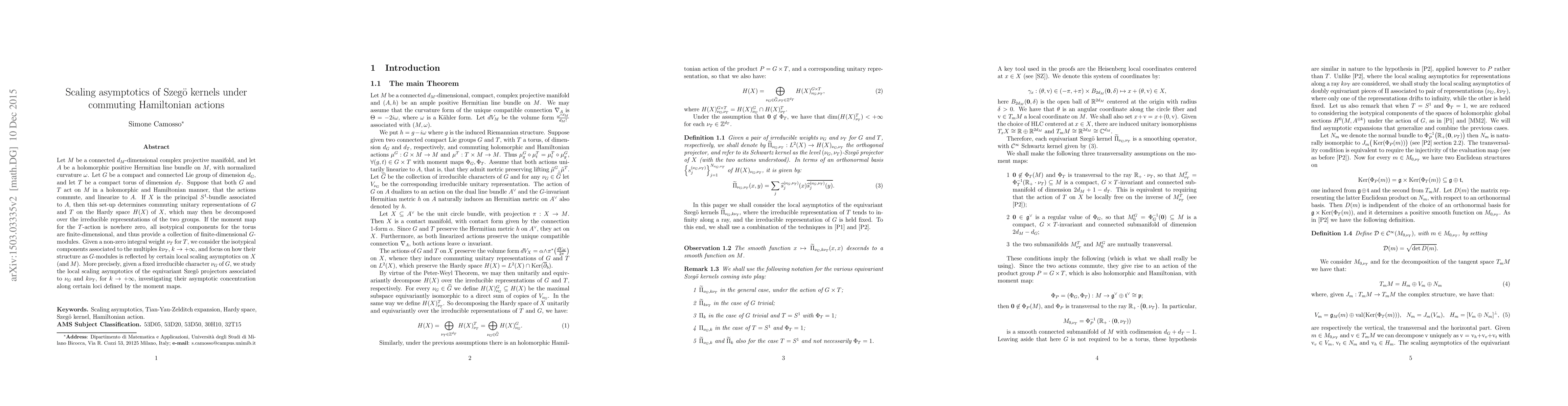 Let M be a connected d-dimensional complex projective manifold, and let A be a holomorphic positive Hermitian line bundle on M, with normalized curvature. Let G be a compact and connected Lie group of dimension d(G), and let T be a compact torus T of dimension d(T). Suppose that both G and T act on M in a holomorphic and Hamiltonian manner, that the actions commute, and linearize to A. If X is the principal circle-bundle associated to A, then this set-up determines commuting unitary representations of G and T on the Hardy space H(X) of X, which may then be decomposed over the irreducible representations of the two groups. If the moment map for the T-action is nowhere zero, all isotypical components for the torus are finite-dimensional, and thus provide a collection of finite-dimensional G-modules. Given a non-zero integral weight n(T) for T, we consider the isotypical components associated to the multiples kn(T), k that goes to infinity, and focus on how their structure as G-modules is reflected by certain local scaling asymptotics on X (and M). More precisely, given a fixed irreducible character n(G) of G, we study the local scaling asymptotics of the equivariant Szeg\H{o} projectors associated to n(G) and kn(T), for k that goes to infinity, investigating their asymptotic concentration along certain loci defined by the moment maps.
