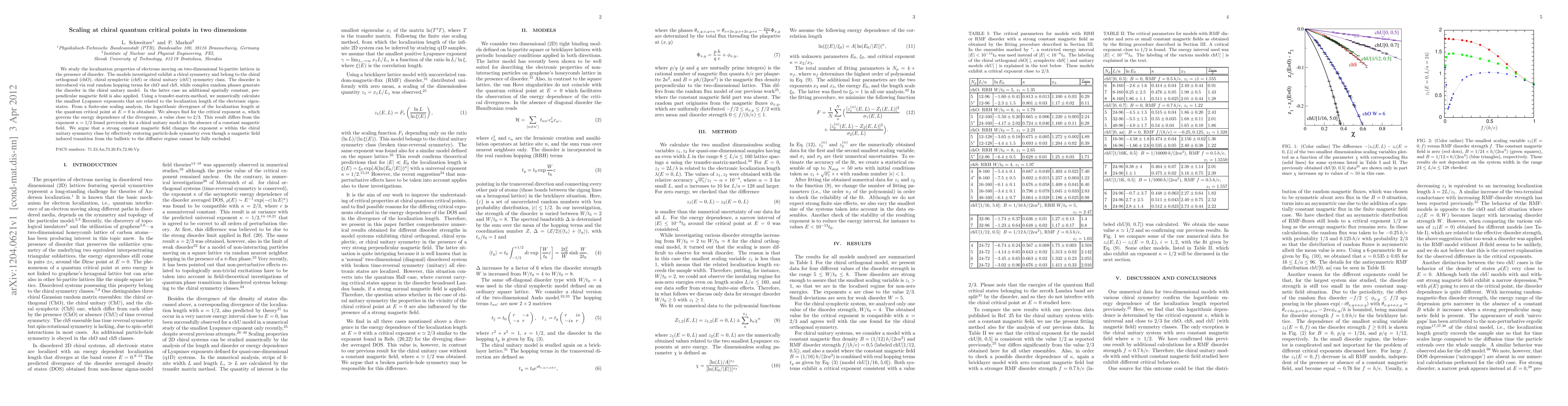We study the localization properties of electrons moving on two-dimensional bi-partite lattices in the presence of disorder. The models investigated exhibit a chiral symmetry and belong to the chiral orthogonal (chO), chiral symplectic (chS) or chiral unitary (chU) symmetry class. The disorder is introduced via real random hopping terms for chO and chS, while complex random phases generate the disorder in the chiral unitary model. In the latter case an additional spatially constant, perpendicular magnetic field is also applied. Using a transfer-matrix-method, we numerically calculate the smallest Lyapunov exponents that are related to the localization length of the electronic eigenstates. From a finite-size scaling analysis, the logarithmic divergence of the localization length at the quantum critical point at E=0 is obtained. We always find for the critical exponent \kappa, which governs the energy dependence of the divergence, a value close to 2/3. This result differs from the exponent \kappa=1/2 found previously for a chiral unitary model in the absence of a constant magnetic field. We argue that a strong constant magnetic field changes the exponent \kappa within the chiral unitary symmetry class by effectively restoring particle-hole symmetry even though a magnetic field induced transition from the ballistic to the diffusive regime cannot be fully excluded.