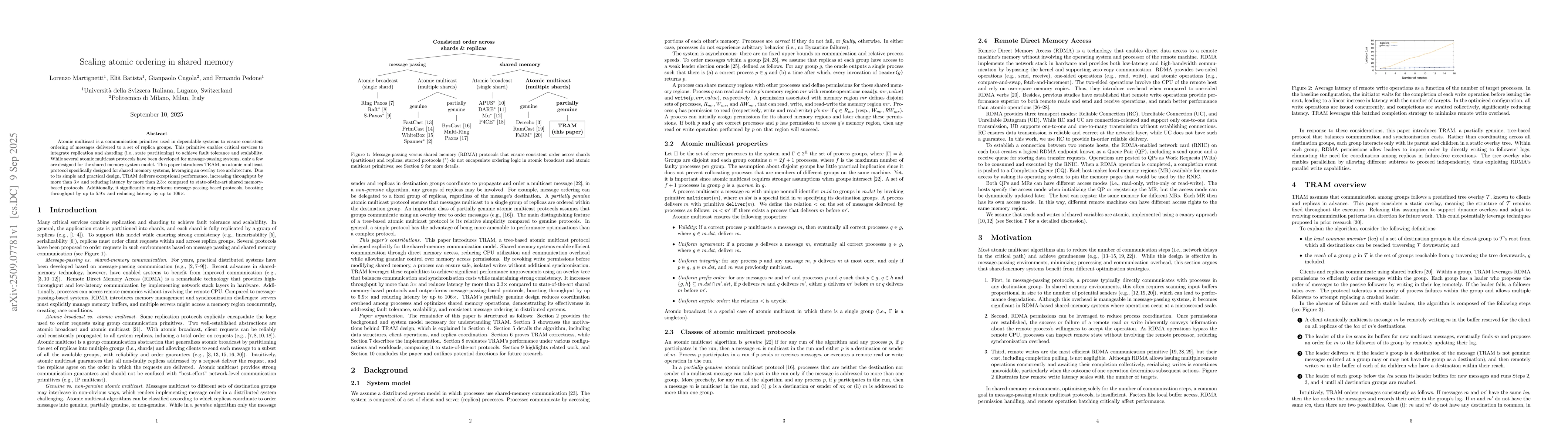 Atomic multicast is a communication primitive used in dependable systems to ensure consistent ordering of messages delivered to a set of replica groups. This primitive enables critical services to integrate replication and sharding (i.e., state partitioning) to achieve fault tolerance and scalability. While several atomic multicast protocols have been developed for message-passing systems, only a few are designed for the shared memory system model. This paper introduces TRAM, an atomic multicast protocol specifically designed for shared memory systems, leveraging an overlay tree architecture. Due to its simple and practical design, TRAM delivers exceptional performance, increasing throughput by more than 3$\times$ and reducing latency by more than 2.3$\times$ compared to state-of-the-art shared memory-based protocols. Additionally, it significantly outperforms message-passing-based protocols, boosting throughput by up to 5.9$\times$ and reducing latency by up to 106$\times$.