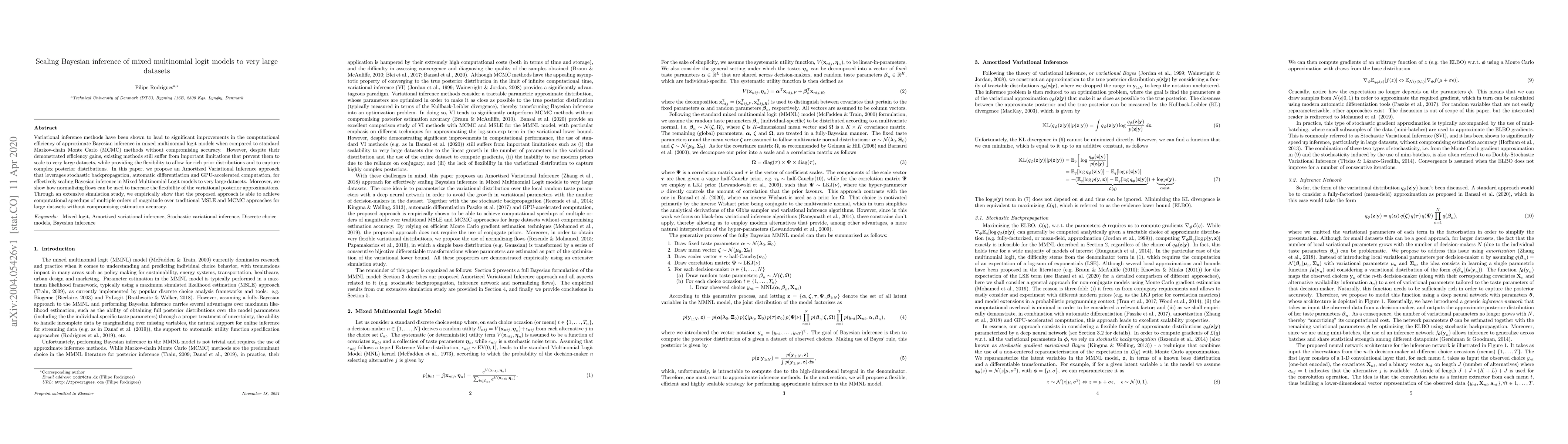 This paper proposes an Amortized Variational Inference method for scaling Bayesian inference in Mixed Multinomial Logit models to large datasets, leveraging GPU-accelerated computation and normalizing flows for improved flexibility. The approach achieves significant computational speedups over traditional methods without compromising accuracy.