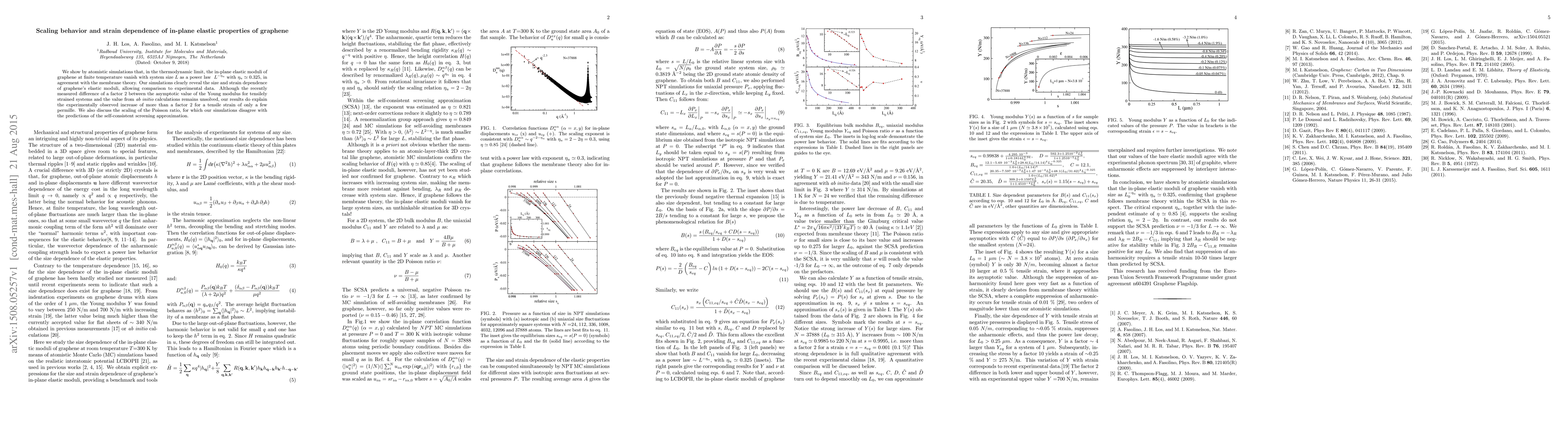 This paper uses atomistic simulations to demonstrate that graphene's in-plane elastic moduli scale with system size according to a power law, aligning with membrane theory. The study also highlights the strain dependence of these moduli, explaining the observed increase in Young's modulus under tensile strain, though discrepancies with ab initio calculations remain.