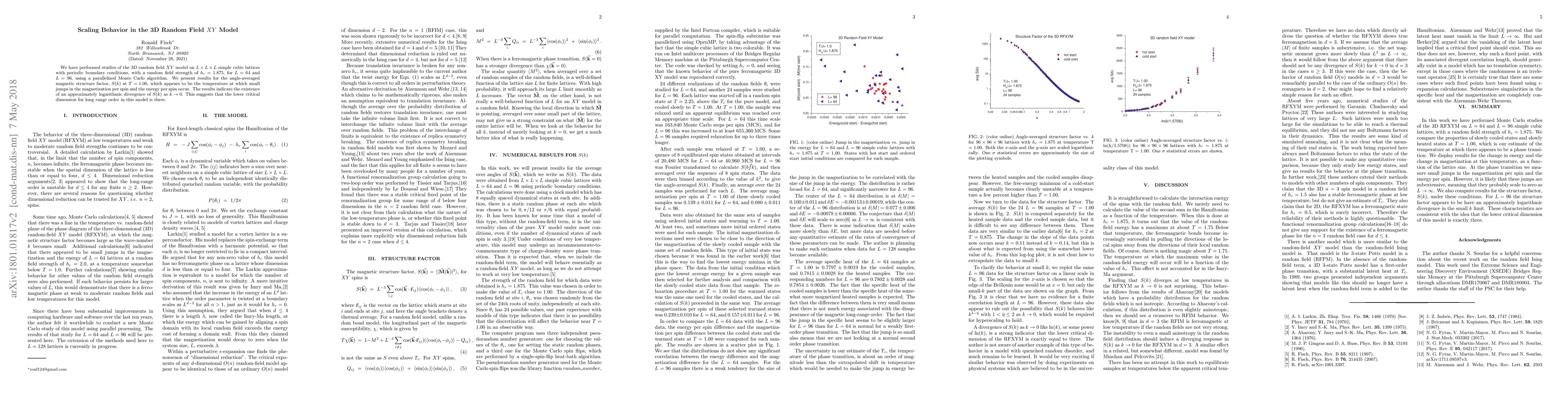 We have performed studies of the 3D random field $XY$ model on $L \times L \times L$ simple cubic lattices with periodic boundary conditions, with a random field strength of $h_r$ = 1.875, for $L = 64$ and $L = 96$, using a parallelized Monte Carlo algorithm. We present results for the angle-averaged magnetic structure factor, $S ( k )$ at $T = 1.00$, which appears to be the temperature at which small jumps in the magnetization per spin and the energy per spin occur. The results indicate the existence of an approximately logarithmic divergence of $S ( k )$ as $k \to 0$. This suggests that the lower critical dimension for long range order in this model is three.