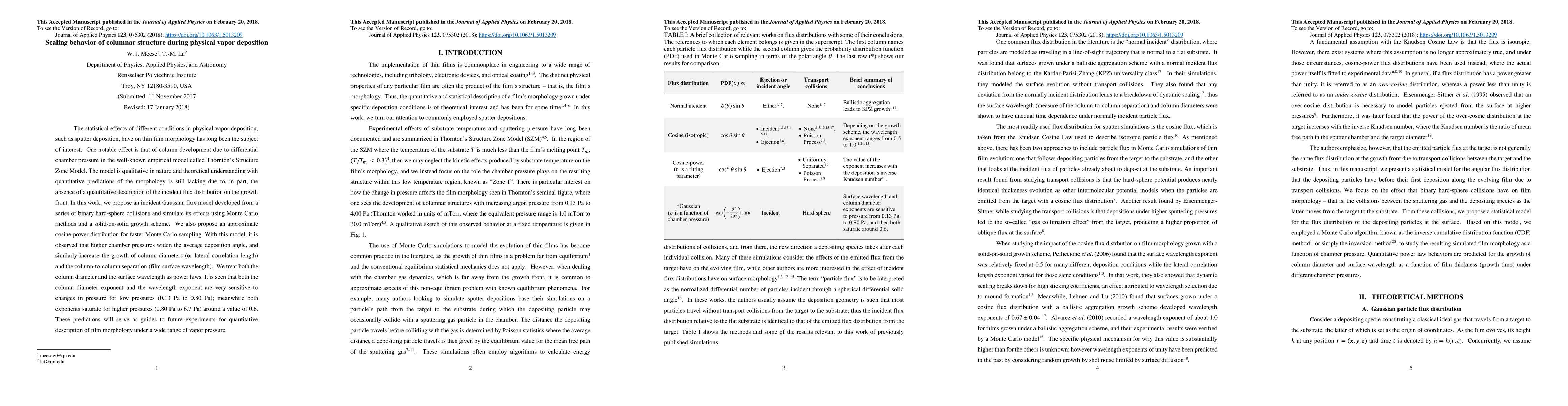 This paper proposes a Gaussian flux model for the incident flux distribution during physical vapor deposition, using Monte Carlo simulations to predict the effects of varying chamber pressures on thin film morphology. The study finds that lower pressures (0.13 Pa to 0.80 Pa) significantly affect the scaling behavior of column diameters and surface wavelengths, while higher pressures (0.80 Pa to 6.7 Pa) lead to saturation around a value of 0.6, providing insights for future experimental investigations.