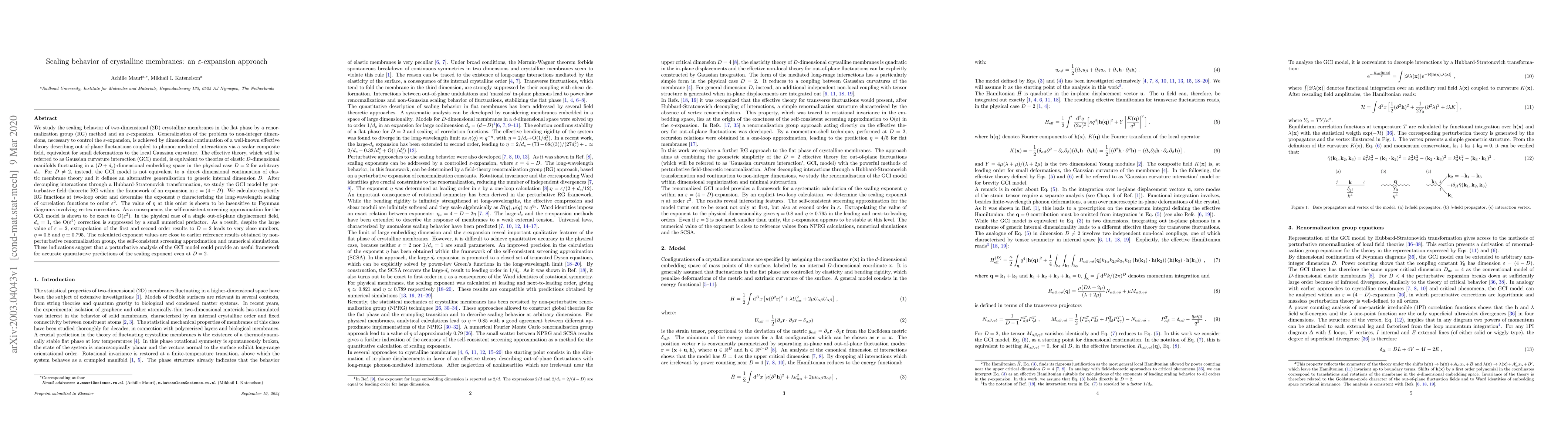 We study the scaling behavior of two-dimensional (2D) crystalline membranes in the flat phase by a renormalization group (RG) method and an $\epsilon$-expansion. Generalization of the problem to non-integer dimensions, necessary to control the $\epsilon$-expansion, is achieved by dimensional continuation of a well-known effective theory describing out-of-plane fluctuations coupled to phonon-mediated interactions via a scalar composite field, equivalent for small deformations to the local Gaussian curvature. The effective theory, which will be referred to as Gaussian curvature interaction (GCI) model, is equivalent to theories of elastic $D$-dimensional manifolds fluctuating in a $(D + d_{c})$-dimensional embedding space in the physical case $D = 2$ for arbitrary $d_{c}$. For $D\neq 2$, instead, the GCI model is not equivalent to a direct dimensional continuation of elastic membrane theory and it defines an alternative generalization to generic internal dimension $D$. We calculate explicitly RG functions at two-loop order and determine the exponent $\eta$ characterizing the long-wavelength scaling of correlation functions to order $\epsilon^{2}$ in an $\epsilon=(4-D)$-expansion. The self-consistent screening approximation (SCSA) for the GCI model is shown to be exact to O($\epsilon^{2}$). For $d_{c} = 1$, the O($\epsilon^{2}$) correction is suppressed by a small numerical prefactor. As a result, despite the large value of $\epsilon = 2$, extrapolation of the first and second order results to $D = 2$ leads to very close numbers, $\eta = 0.8$ and $\eta \simeq 0.795$. The calculated exponent values are close to earlier reference results obtained by non-perturbative RG, the SCSA and numerical simulations. These indications suggest that a perturbative analysis of the GCI model could provide an useful framework for accurate quantitative predictions of the scaling exponent even at $D = 2$.