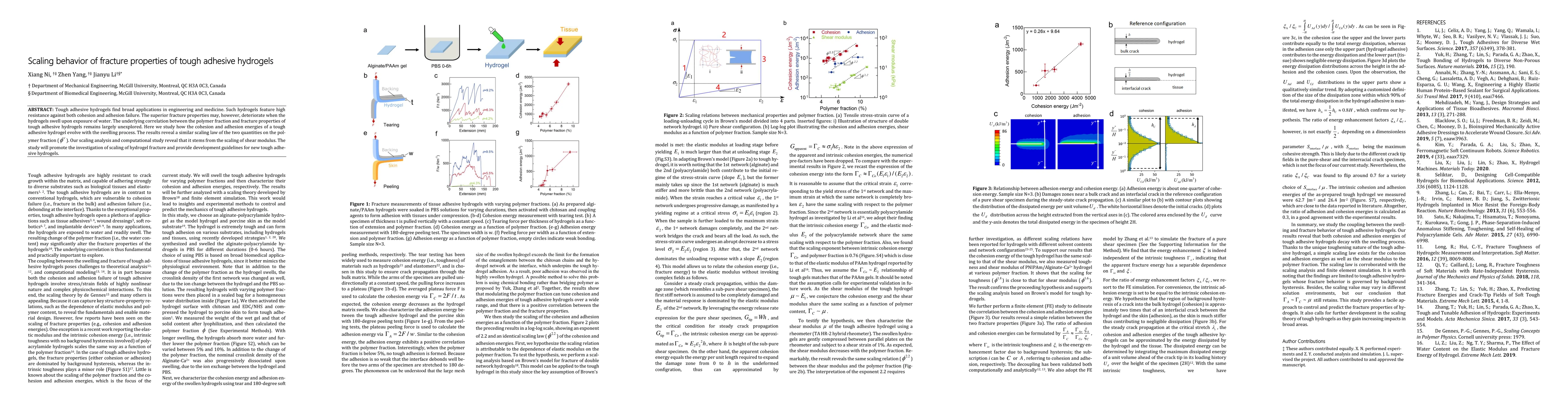 This research explores how the fracture properties of tough adhesive hydrogels change with swelling, revealing a scaling law correlating cohesion and adhesion energies with the polymer fraction. The findings show that the observed scaling behavior stems from the shear modulus's scaling, providing insights for developing new tough adhesive hydrogels.