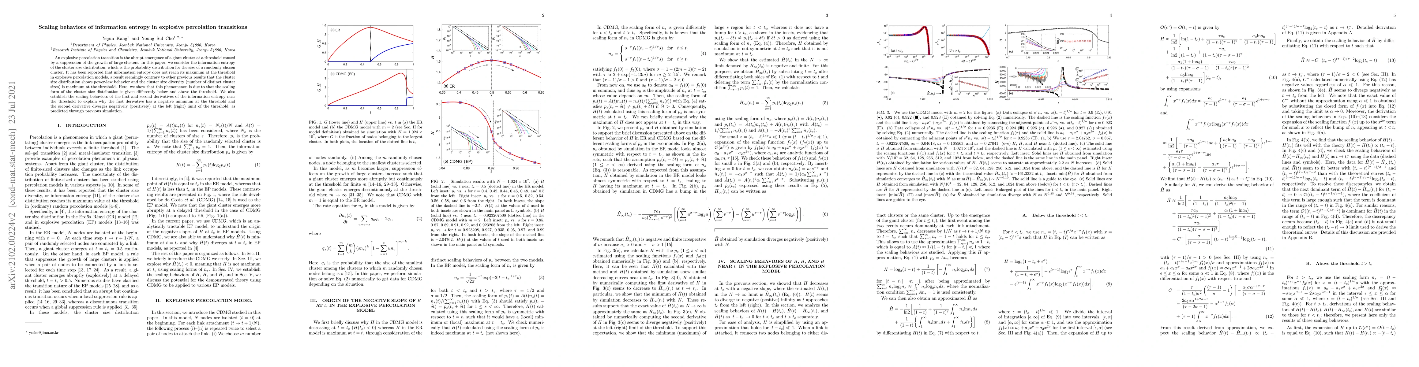 An explosive percolation transition is the abrupt emergence of a giant cluster at a threshold caused by a suppression of the growth of large clusters. In this paper, we consider the information entropy of the cluster size distribution, which is the probability distribution for the size of a randomly chosen cluster. It has been reported that information entropy does not reach its maximum at the threshold in explosive percolation models, a result seemingly contrary to other previous results that the cluster size distribution shows power-law behavior and the cluster size diversity (number of distinct cluster sizes) is maximum at the threshold. Here, we show that this phenomenon is due to that the scaling form of the cluster size distribution is given differently below and above the threshold. We also establish the scaling behaviors of the first and second derivatives of the information entropy near the threshold to explain why the first derivative has a negative minimum at the threshold and the second derivative diverges negatively (positively) at the left (right) limit of the threshold, as predicted through previous simulation.