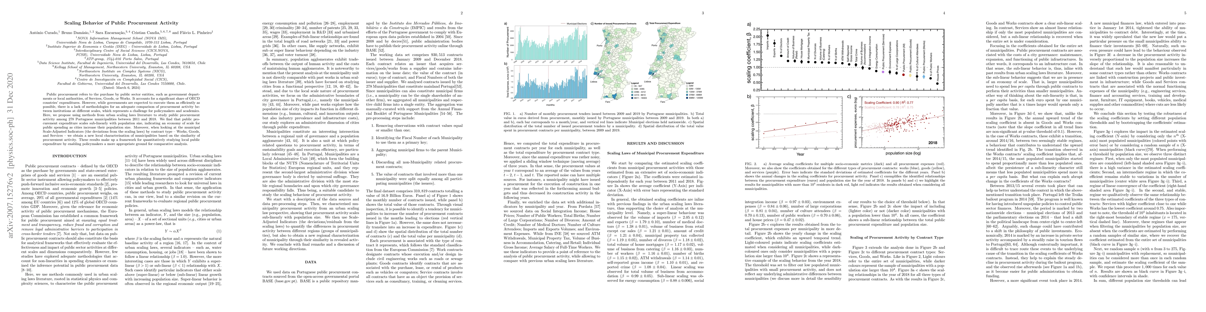 Methods from urban scaling laws literature were used to study public procurement activity among 278 Portuguese municipalities between 2011 and 2018.