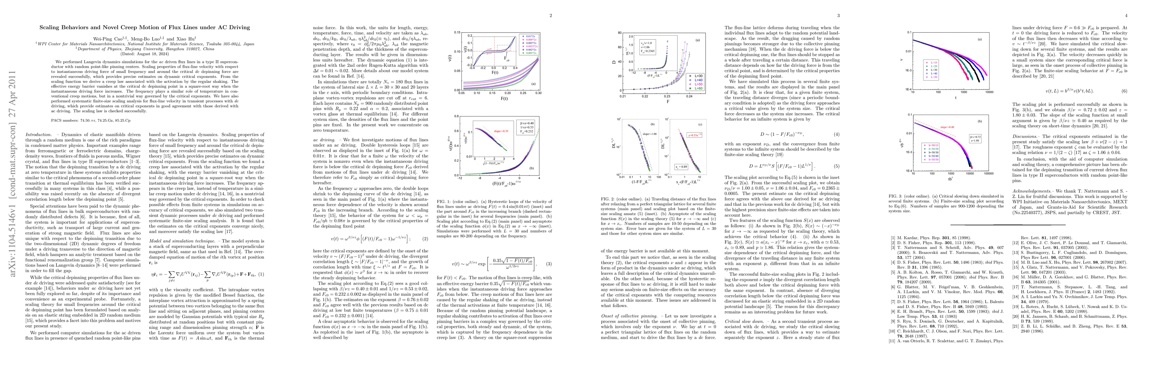 This paper uses Langevin dynamics simulations to study flux-line behavior in type II superconductors under AC driving, revealing scaling properties of flux-line velocity and deriving a novel creep law. The effective energy barrier diminishes as the driving force approaches the critical dc depinning force, indicating a frequency-dependent creep mechanism akin to temperature effects.
