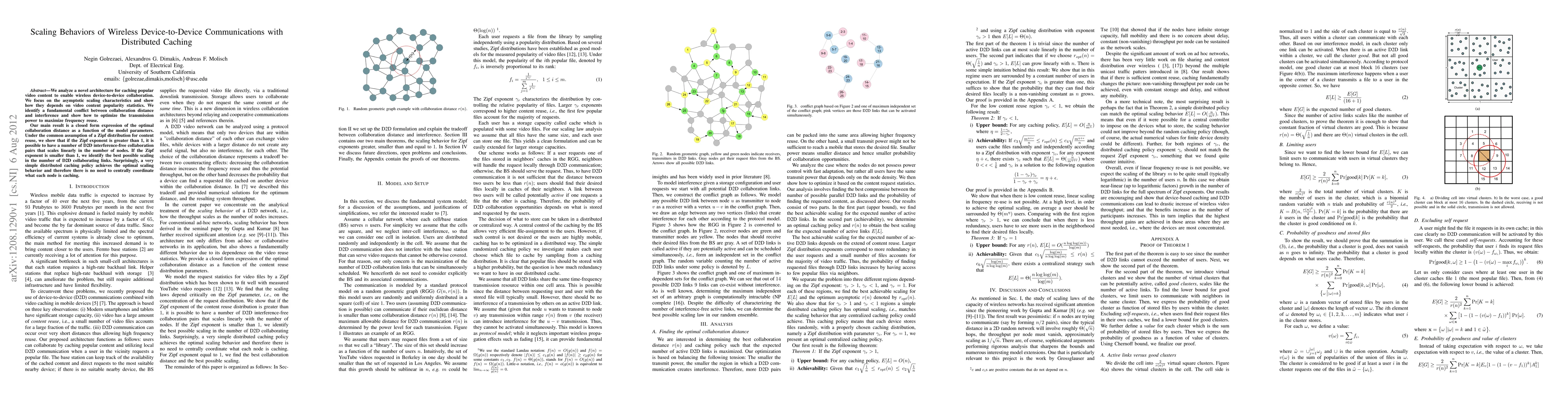 This paper explores a caching architecture for wireless device-to-device (D2D) communications, analyzing how scaling behaviors depend on video content popularity and optimizing transmission power for frequency reuse. It reveals that under a Zipf distribution, a simple distributed caching policy can achieve optimal scaling without central coordination.