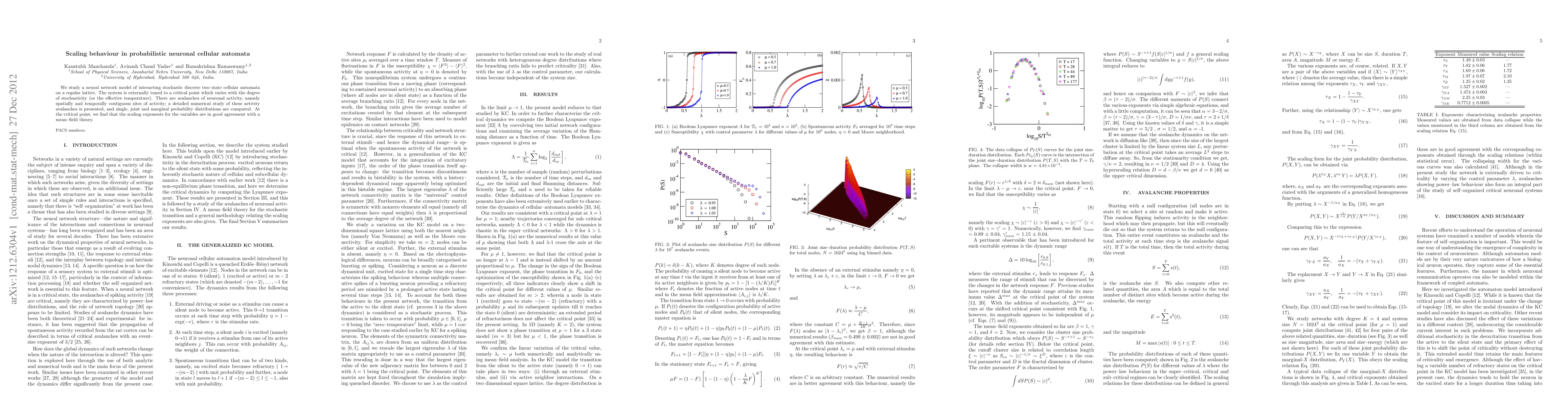 We study a neural network model of interacting stochastic discrete two--state cellular automata on a regular lattice. The system is externally tuned to a critical point which varies with the degree of stochasticity (or the effective temperature). There are avalanches of neuronal activity, namely spatially and temporally contiguous sites of activity; a detailed numerical study of these activity avalanches is presented, and single, joint and marginal probability distributions are computed. At the critical point, we find that the scaling exponents for the variables are in good agreement with a mean--field theory.