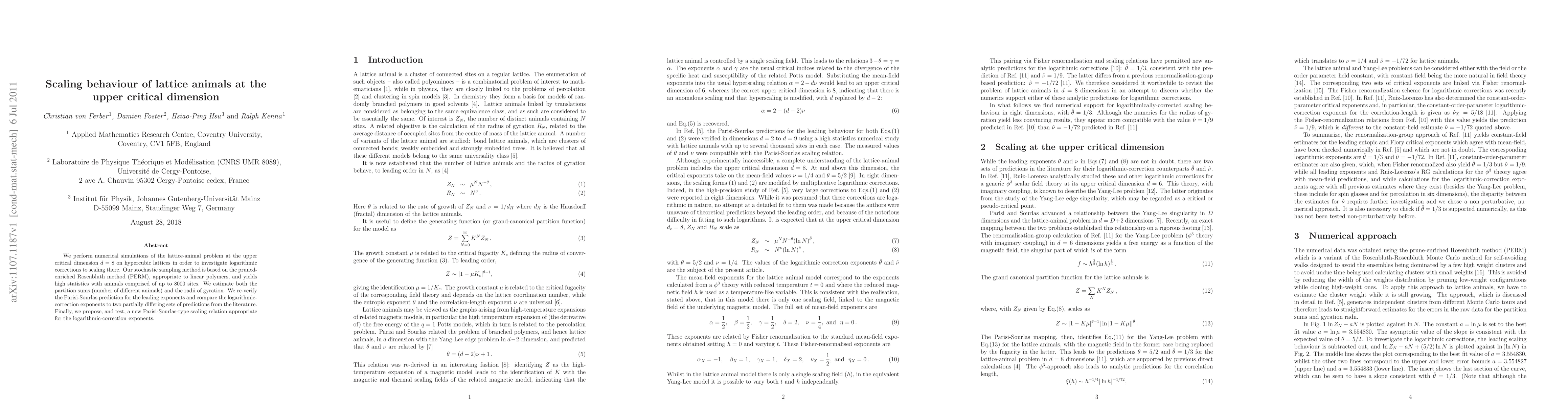 We perform numerical simulations of the lattice-animal problem at the upper critical dimension d=8 on hypercubic lattices in order to investigate logarithmic corrections to scaling there. Our stochastic sampling method is based on the pruned-enriched Rosenbluth method (PERM), appropriate to linear polymers, and yields high statistics with animals comprised of up to 8000 sites. We estimate both the partition sums (number of different animals) and the radii of gyration. We re-verify the Parisi-Sourlas prediction for the leading exponents and compare the logarithmic-correction exponents to two partially differing sets of predictions from the literature. Finally, we propose, and test, a new Parisi-Sourlas-type scaling relation appropriate for the logarithmic-correction exponents.