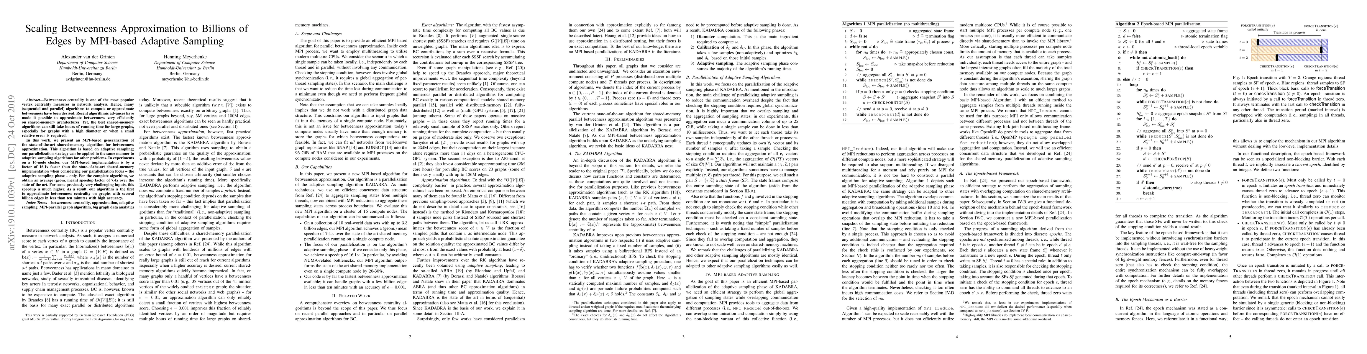 This research presents an MPI-based algorithm that significantly speeds up the approximation of Betweenness Centrality in large networks, reducing computation time from hours to minutes for graphs with billions of edges. The method leverages adaptive sampling, achieving a geometric mean speedup of 7.4x over existing shared-memory implementations.