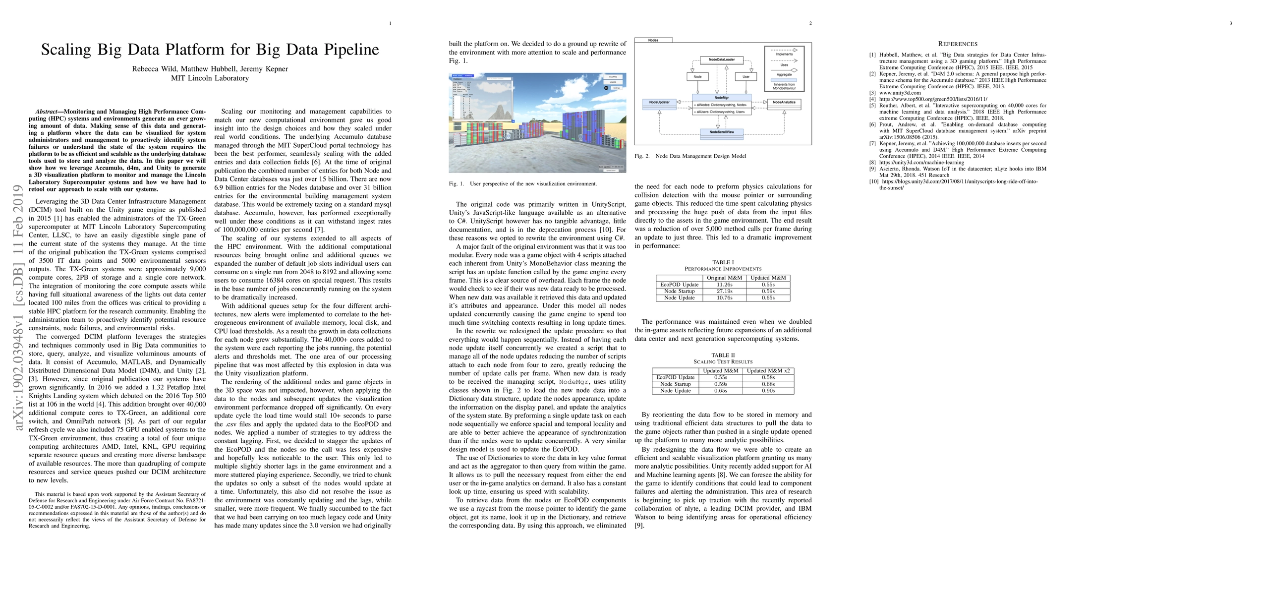 This paper details the development of a scalable big data platform using Accumulo, d4m, and Unity to visualize and manage the data generated by high-performance computing systems. The authors discuss the challenges and adaptations required to scale the platform effectively with the Lincoln Laboratory Supercomputer systems.