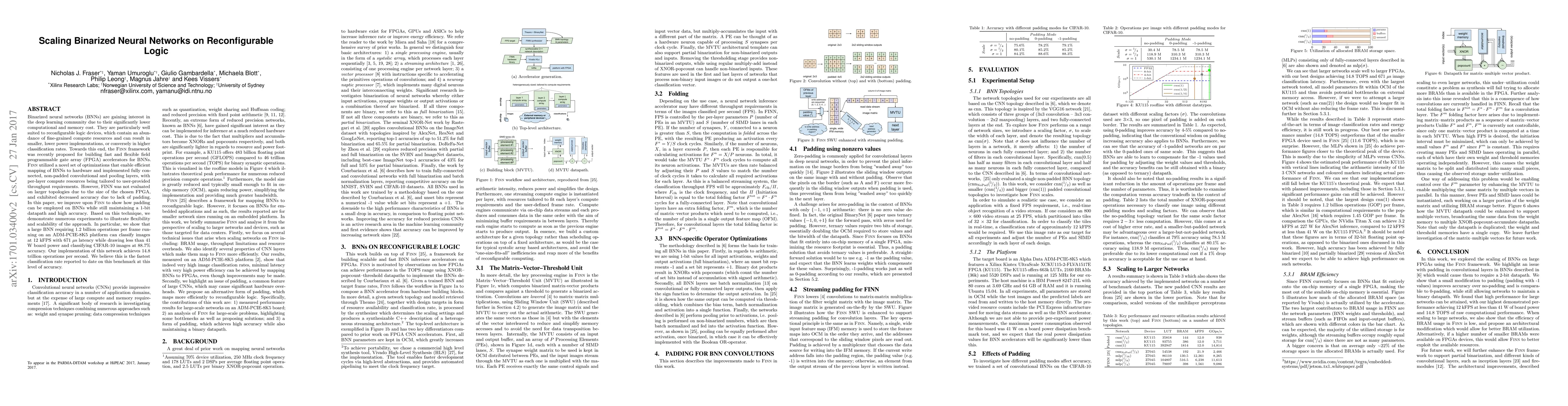 Binarized neural networks (BNNs) are gaining interest in the deep learning community due to their significantly lower computational and memory cost. They are particularly well suited to reconfigurable logic devices, which contain an abundance of fine-grained compute resources and can result in smaller, lower power implementations, or conversely in higher classification rates. Towards this end, the Finn framework was recently proposed for building fast and flexible field programmable gate array (FPGA) accelerators for BNNs. Finn utilized a novel set of optimizations that enable efficient mapping of BNNs to hardware and implemented fully connected, non-padded convolutional and pooling layers, with per-layer compute resources being tailored to user-provided throughput requirements. However, FINN was not evaluated on larger topologies due to the size of the chosen FPGA, and exhibited decreased accuracy due to lack of padding. In this paper, we improve upon Finn to show how padding can be employed on BNNs while still maintaining a 1-bit datapath and high accuracy. Based on this technique, we demonstrate numerous experiments to illustrate flexibility and scalability of the approach. In particular, we show that a large BNN requiring 1.2 billion operations per frame running on an ADM-PCIE-8K5 platform can classify images at 12 kFPS with 671 us latency while drawing less than 41 W board power and classifying CIFAR-10 images at 88.7% accuracy. Our implementation of this network achieves 14.8 trillion operations per second. We believe this is the fastest classification rate reported to date on this benchmark at this level of accuracy.