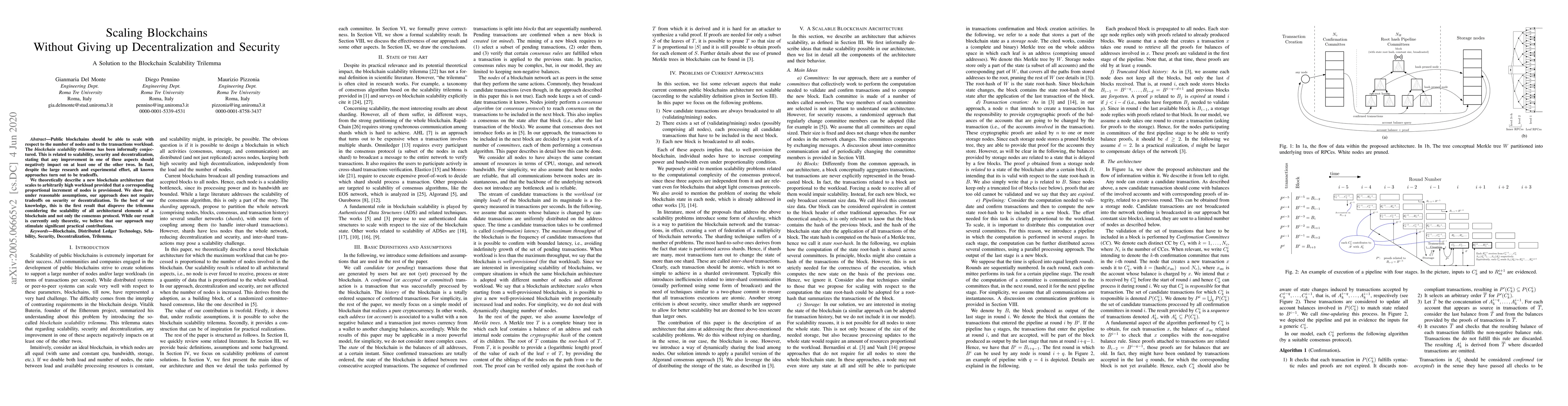 Public blockchains should be able to scale with respect to the number of nodes and to the transactions workload. The blockchain scalability trilemma has been informally conjectured. This is related to scalability, security and decentralization, stating that any improvement in one of these aspects should negatively impact on at least one of the other twos. In fact, despite the large research and experimental effort, all known approaches turn out to be tradeoffs. We theoretically describe a new blockchain architecture that scales to arbitrarily high workload provided that a corresponding proportional increment of nodes is provisioned. We show that, under reasonable assumptions, our approach does not require tradeoffs on security or decentralization. To the best of our knowledge, this is the first result that disprove the trilemma considering the scalability of all architectural elements of a blockchain and not only the consensus protocol. While our result is currently only theoretic, we believe that ot our approach may stimulate significant practical contributions.