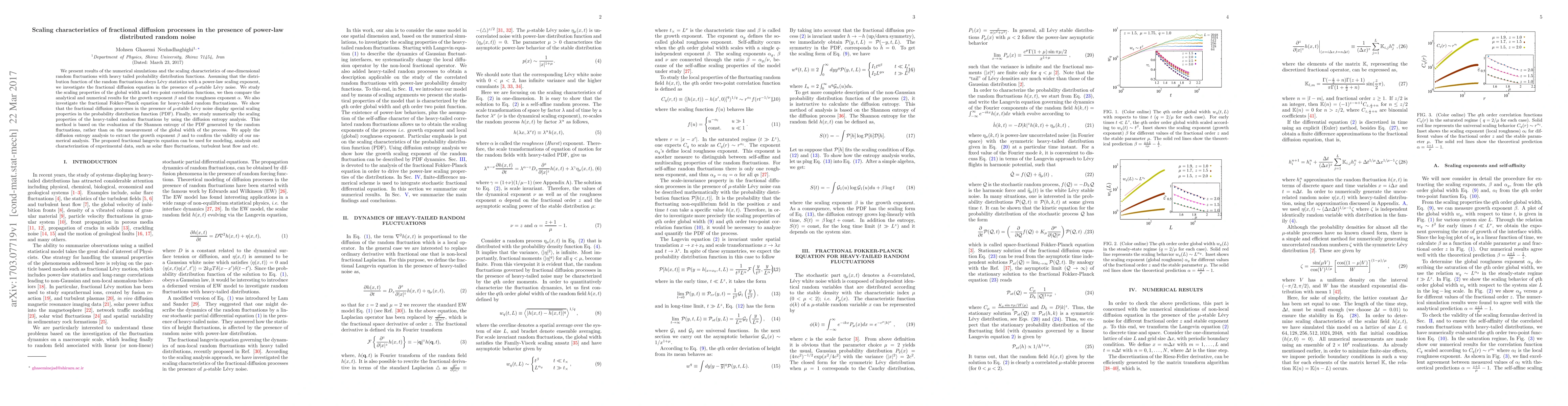 We present results of the numerical simulations and the scaling characteristics of one-dimensional random fluctuations with heavy tailed probability distribution functions. Assuming that the distribution function of the random fluctuations obeys L\'evy statistics with a power-law scaling exponent, we investigate the fractional diffusion equation in the presence of $\mu$-stable L\'evy noise. e study the scaling properties of the global width and two point correlation functions, we then compare the analytical and numerical results for the growth exponent $\beta$ and the roughness exponent $\alpha$. We also investigate the fractional Fokker-Planck equation for heavy-tailed random fluctuations. We show that the fractional diffusion processes in the presence of $\mu$-stable L\'evy noise display special scaling properties in the probability distribution function (PDF). Finally, we study numerically the scaling properties of the heavy-tailed random fluctuations by using the diffusion entropy analysis. This method is based on the evaluation of the Shannon entropy of the PDF generated by the random fluctuations, rather than on the measurement of the global width of the process. We apply the diffusion entropy analysis to extract the growth exponent $\beta$ and to confirm the validity of our numerical analysis. The proposed fractional langevin equation can be used for modeling, analysis and characterization of experimental data, such as solar flare fluctuations, turbulent heat flow and etc.