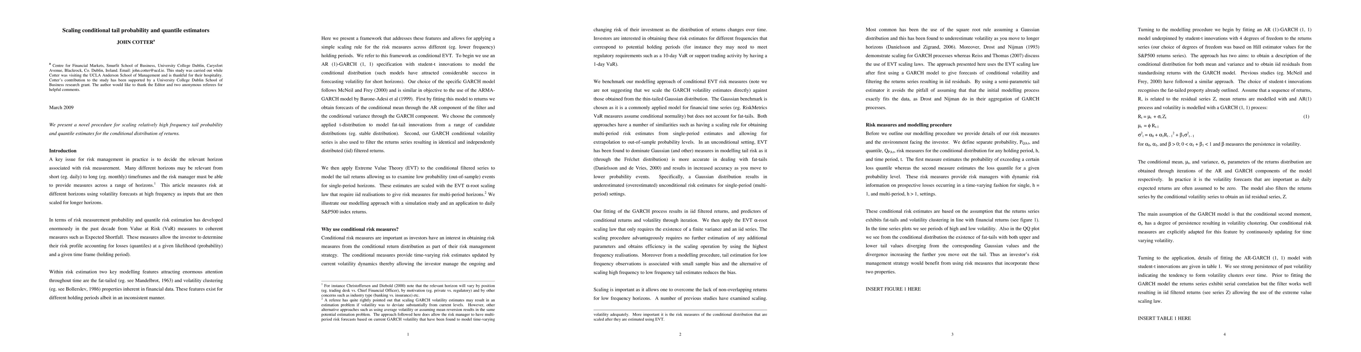 Summary: This paper introduces a new method to accurately scale high-frequency tail probability and quantile estimates for the conditional distribution of financial returns, enhancing the precision of risk assessment models.