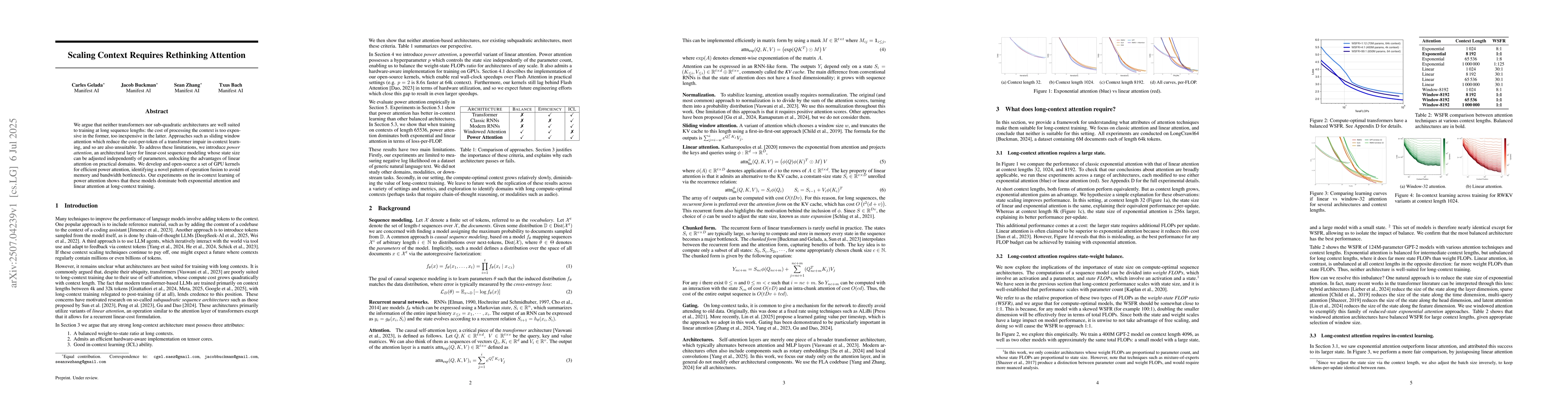We argue that neither transformers nor sub-quadratic architectures are well suited to training at long sequence lengths: the cost of processing the context is too expensive in the former, too inexpensive in the latter. Approaches such as sliding window attention which reduce the cost-per-token of a transformer impair in-context learning, and so are also unsuitable. To address these limitations, we introduce power attention, an architectural layer for linear-cost sequence modeling whose state size can be adjusted independently of parameters, unlocking the advantages of linear attention on practical domains. We develop and open-source a set of GPU kernels for efficient power attention, identifying a novel pattern of operation fusion to avoid memory and bandwidth bottlenecks. Our experiments on the in-context learning of power attention shows that these models dominate both exponential attention and linear attention at long-context training.
