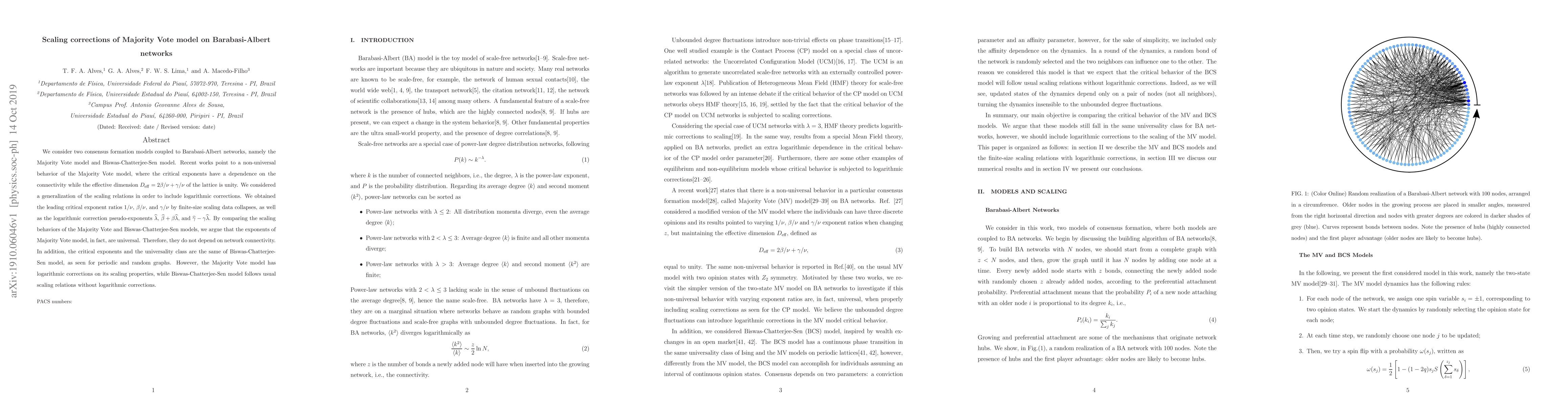 This paper investigates the scaling behavior of the Majority Vote model on Barabasi-Albert networks, finding that while critical exponents initially seemed non-universal, they are actually universal and independent of network connectivity. The study also identifies logarithmic corrections in the Majority Vote model's scaling, contrasting it with the Biswas-Chatterjee-Sen model, which follows standard scaling relations.