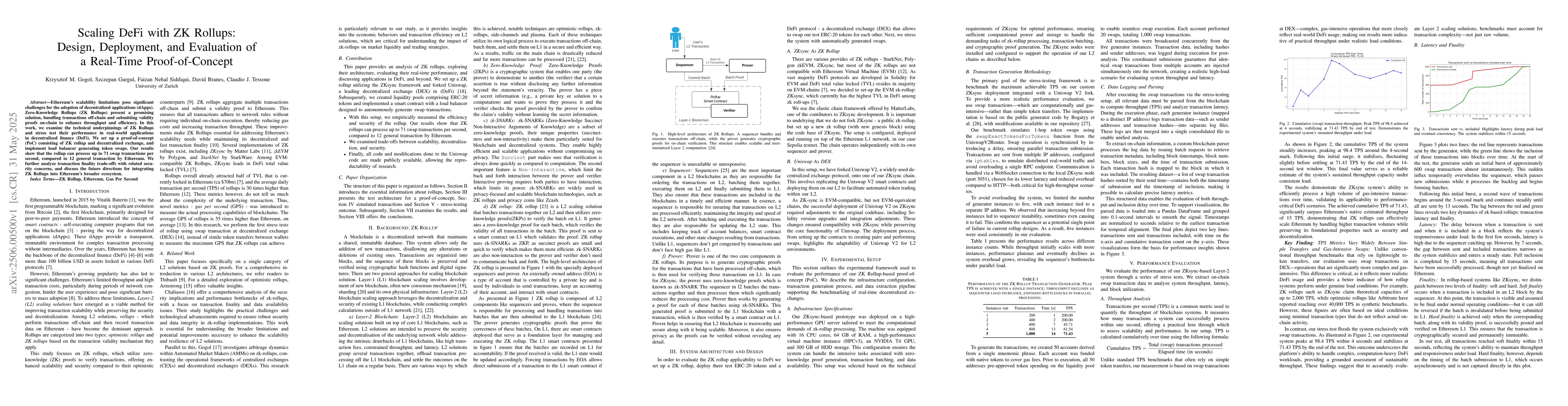 Ethereum's scalability limitations pose significant challenges for the adoption of decentralized applications (dApps). Zero-Knowledge Rollups (ZK Rollups) present a promising solution, bundling transactions off-chain and submitting validity proofs on-chain to enhance throughput and efficiency. In this work, we examine the technical underpinnings of ZK Rollups and stress test their performance in real-world applications in decentralized finance (DeFi). We set up a proof-of-concept (PoC) consisting of ZK rollup and decentralized exchange, and implement load balancer generating token swaps. Our results show that the rollup can process up to 71 swap transactions per second, compared to 12 general transaction by Ethereum. We further analyze transaction finality trade-offs with related security concerns, and discuss the future directions for integrating ZK Rollups into Ethereum's broader ecosystem.
