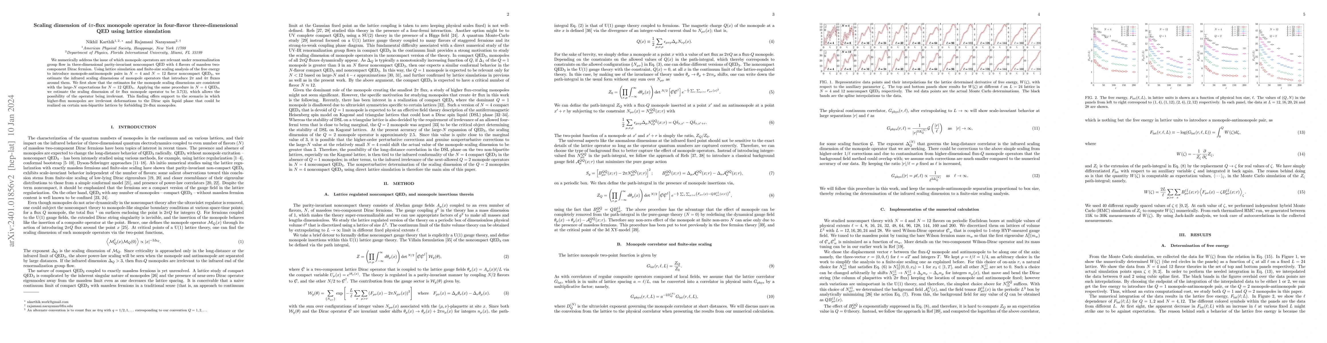 We numerically address the issue of which monopole operators are relevant under renormalization group flow in three-dimensional parity-invariant noncompact QED with $4$ flavors of massless two-component Dirac fermion. Using lattice simulation and finite-size scaling analysis of the free energy to introduce monopole-antimonopole pairs in $N=4$ and $N=12$ flavor noncompact QED$_3$, we estimate the infrared scaling dimensions of monopole operators that introduce $2\pi$ and $4\pi$ fluxes around them. We first show that the estimates for the monopole scaling dimensions are consistent with the large-$N$ expectations for $N=12$ QED$_3$. Applying the same procedure in $N=4$ QED$_3$, we estimate the scaling dimension of $4\pi$ flux monopole operator to be $3.7(3)$, which allows the possibility of the operator being irrelevant. This finding offers support to the scenario in which higher-flux monopoles are irrelevant deformations to the Dirac spin liquid phase that could be realized on certain non-bipartite lattices by forbidding $2\pi$-flux monopoles.