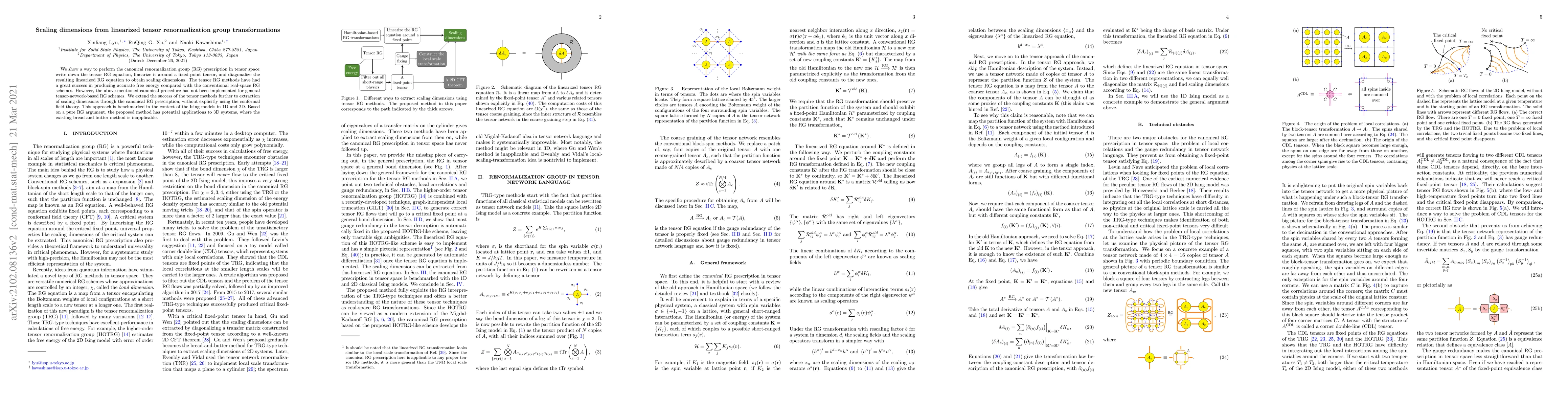 This paper presents a method to extract scaling dimensions using tensor renormalization group (RG) transformations by linearizing the tensor RG equation around a fixed-point tensor and diagonalizing it. This approach extends the success of tensor RG methods to accurately determine scaling dimensions without relying on conformal field theory, and is demonstrated through Ising models in 1D and 2D, with potential applications to 3D systems.