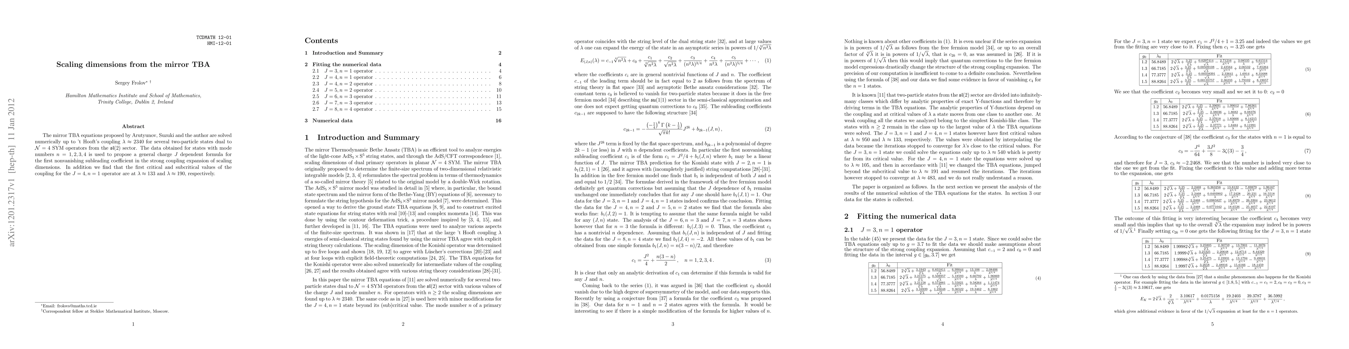 The mirror TBA equations proposed by Arutyunov, Suzuki and the author are solved numerically up to 't Hooft's coupling $\lambda\approx 2340$ for several two-particle states dual to ${\cal N}=4$ SYM operators from the $\sl(2)$ sector. The data obtained for states with mode numbers $n=1,2,3,4$ is used to propose a general charge $J$ dependent formula for the first nonvanishing subleading coefficient in the strong coupling expansion of scaling dimensions. In addition we find that the first critical and subcritical values of the coupling for the $J=4, n=1$ operator are at $\lambda\approx 133$ and $\lambda\approx 190$, respectively.