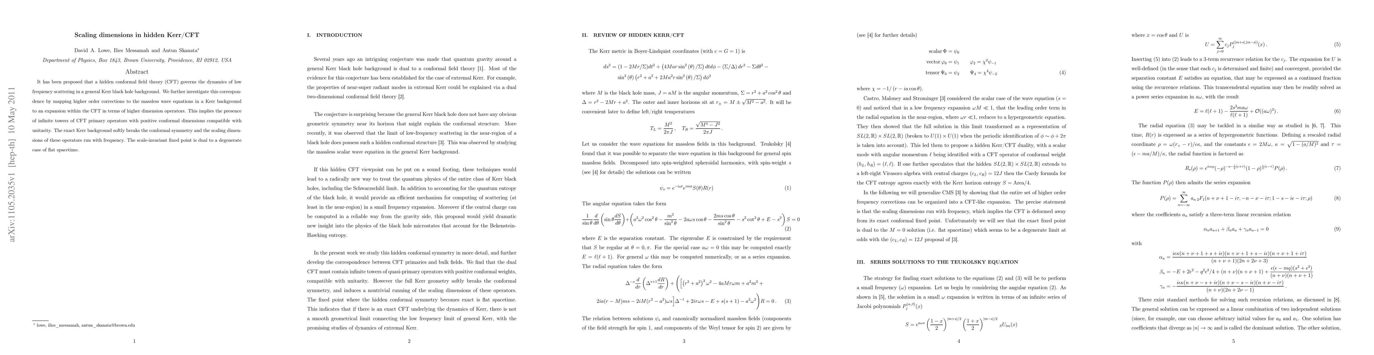 It has been proposed that a hidden conformal field theory (CFT) governs the dynamics of low frequency scattering in a general Kerr black hole background. We further investigate this correspondence by mapping higher order corrections to the massless wave equations in a Kerr background to an expansion within the CFT in terms of higher dimension operators. This implies the presence of infinite towers of CFT primary operators with positive conformal dimensions compatible with unitarity. The exact Kerr background softly breaks the conformal symmetry and the scaling dimensions of these operators run with frequency. The scale-invariant fixed point is dual to a degenerate case of flat spacetime.
