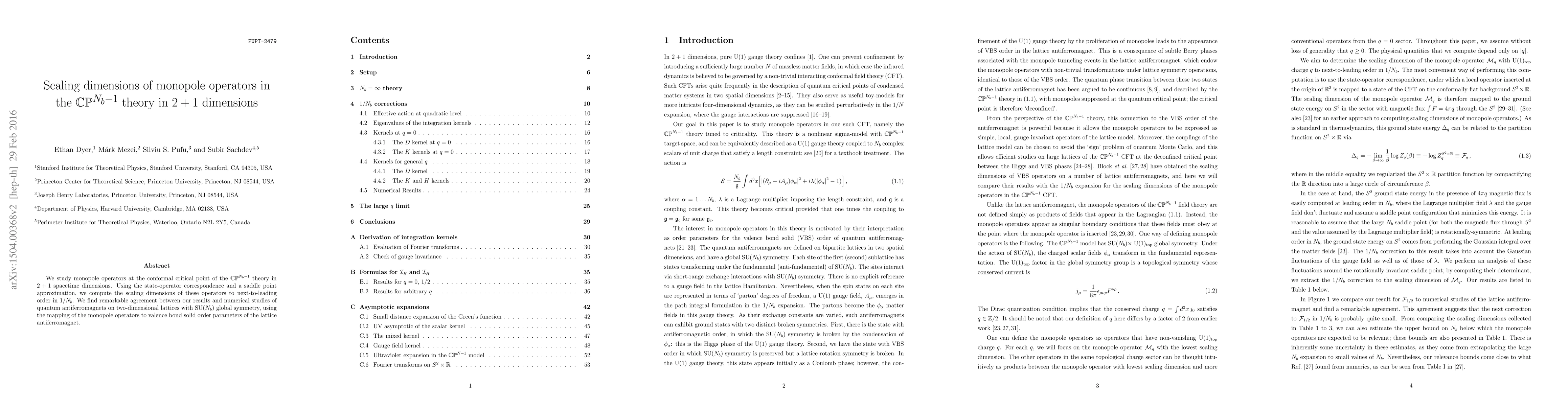 This paper computes the scaling dimensions of monopole operators in the $\mathbb{CP}^{N_b - 1}$ theory at its conformal critical point in $2+1$ dimensions, finding agreement with numerical studies of quantum antiferromagnets via a saddle point approximation and state-operator correspondence. The monopole operators are mapped to valence bond solid order parameters in the lattice antiferromagnet.