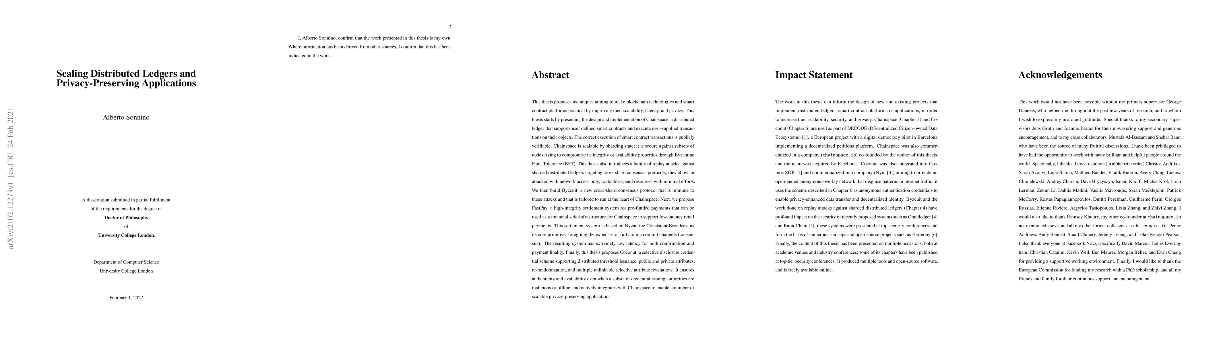 This thesis develops Chainspace, a scalable distributed ledger with sharding and Byzantine Fault Tolerance, and introduces Byzcuit, a resilient cross-shard consensus protocol. It also presents FastPay for low-latency retail payments and Coconut for privacy-preserving credentials, aiming to enhance blockchain scalability, latency, and privacy.