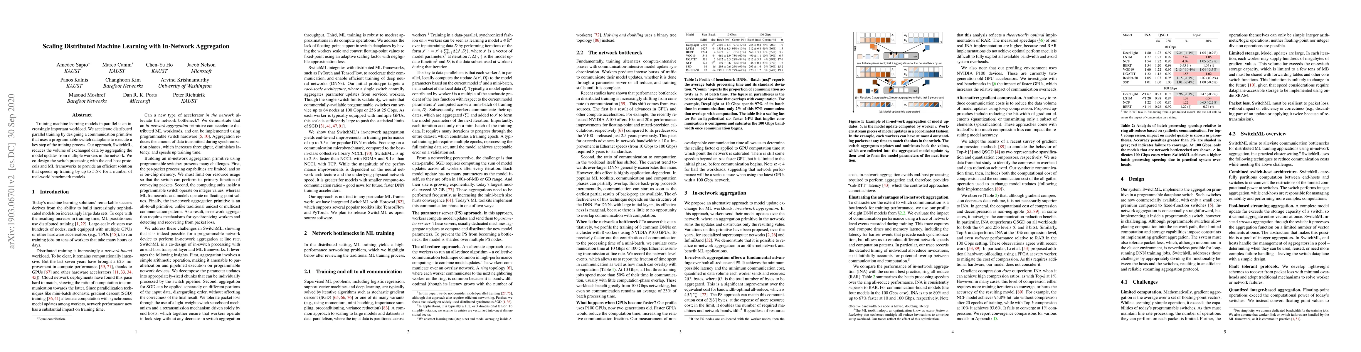 The paper proposes SwitchML, a method to accelerate distributed machine learning training by using a programmable switch to aggregate model updates in the network, significantly reducing data exchange and speeding up training by up to 5.5$\times$. The approach integrates switch processing with end-host protocols and ML frameworks for optimal efficiency.