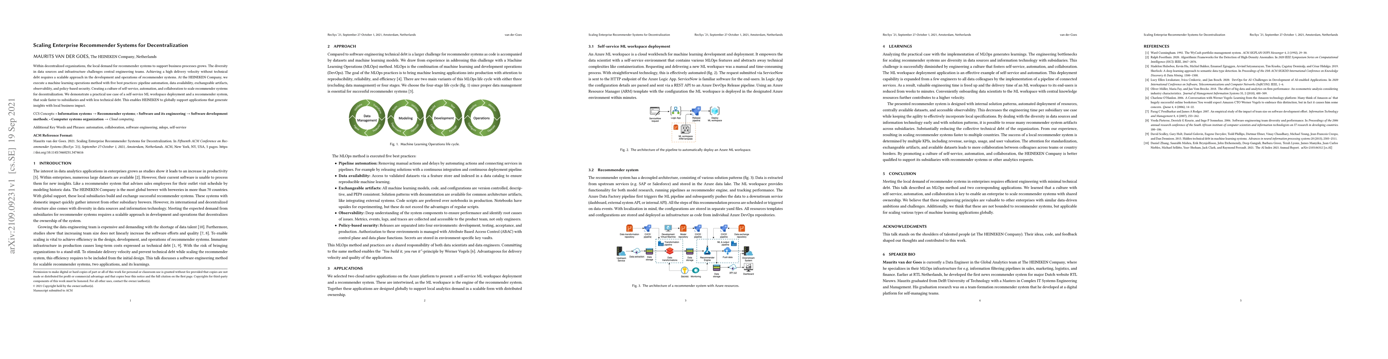 This paper explores scalable practices for developing and operating recommender systems within decentralized enterprises, emphasizing HEINEKEN's approach using machine learning operations with five best practices. It demonstrates a practical deployment of a self-service ML workspace that scales quickly and efficiently to subsidiaries with minimal technical debt.