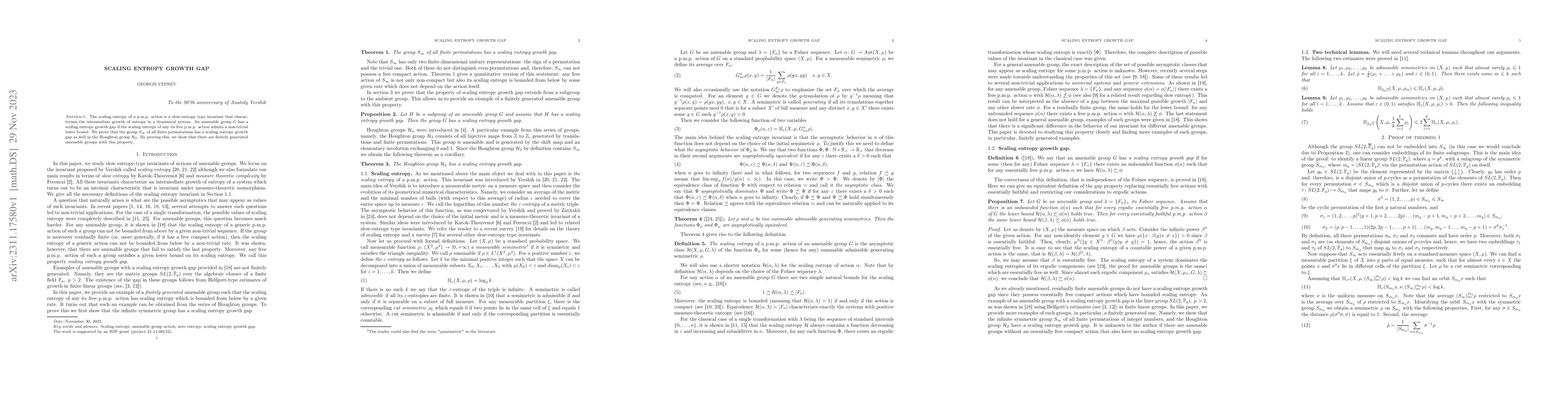 The paper establishes that the permutation group $S_\infty$ and the Houghton group $\mathcal{H}_2$ exhibit a scaling entropy growth gap, demonstrating that certain finitely generated amenable groups have non-trivial lower bounds for their scaling entropy in free p.m.p. actions.