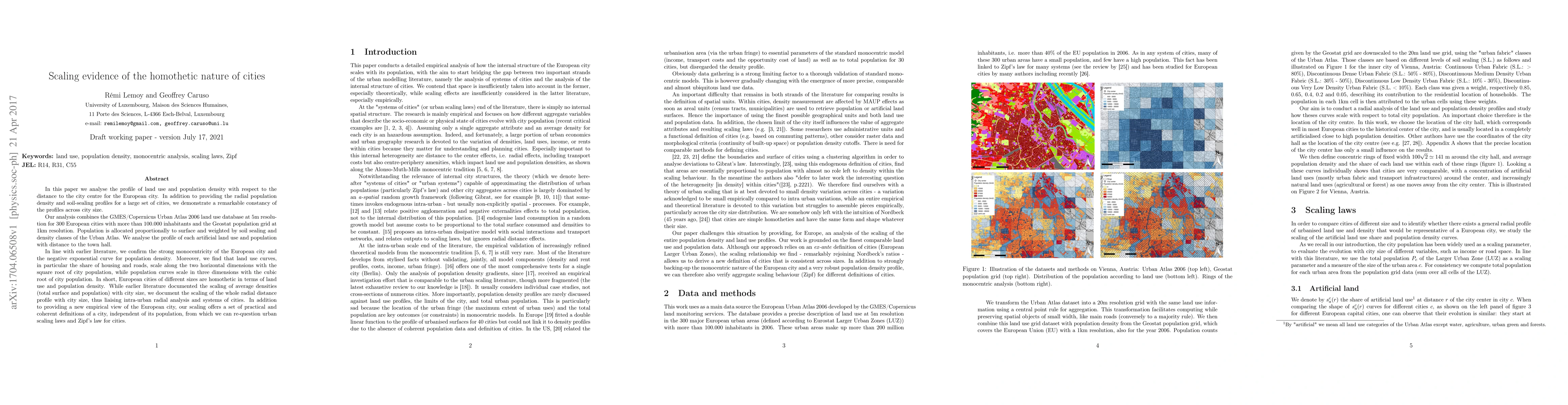 In this paper we analyse the profile of land use and population density with respect to the distance to the city centre for the European city. In addition to providing the radial population density and soil-sealing profiles for a large set of cities, we demonstrate a remarkable constancy of the profiles across city size. Our analysis combines the GMES/Copernicus Urban Atlas 2006 land use database at 5m resolution for 300 European cities with more than 100.000 inhabitants and the Geostat population grid at 1km resolution. Population is allocated proportionally to surface and weighted by soil sealing and density classes of the Urban Atlas. We analyse the profile of each artificial land use and population with distance to the town hall. In line with earlier literature, we confirm the strong monocentricity of the European city and the negative exponential curve for population density. Moreover, we find that land use curves, in particular the share of housing and roads, scale along the two horizontal dimensions with the square root of city population, while population curves scale in three dimensions with the cubic root of city population. In short, European cities of different sizes are homothetic in terms of land use and population density. While earlier literature documented the scaling of average densities (total surface and population) with city size, we document the scaling of the whole radial distance profile with city size, thus liaising intra-urban radial analysis and systems of cities. In addition to providing a new empirical view of the European city, our scaling offers a set of practical and coherent definitions of a city, independent of its population, from which we can re-question urban scaling laws and Zipf's law for cities.
