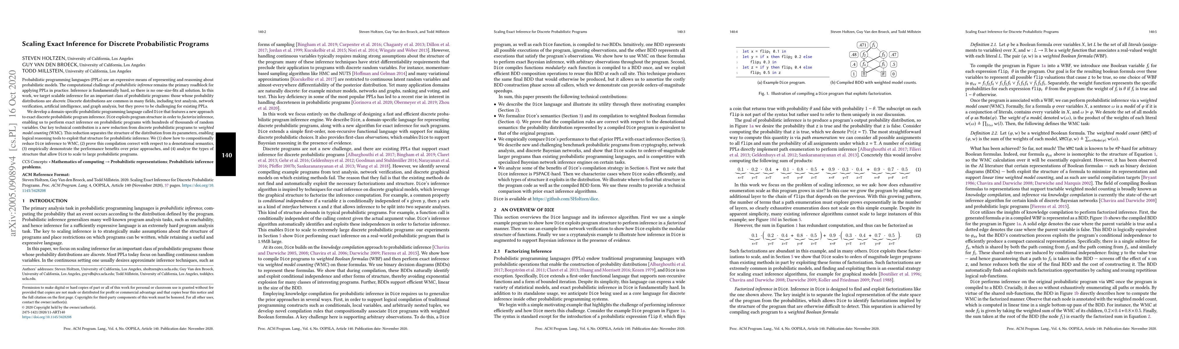 This paper introduces Dice, a domain-specific probabilistic programming language for scalable exact inference in discrete probabilistic programs. It leverages program structure to factorize inference through a reduction to weighted model counting, demonstrating significant performance benefits over existing methods.